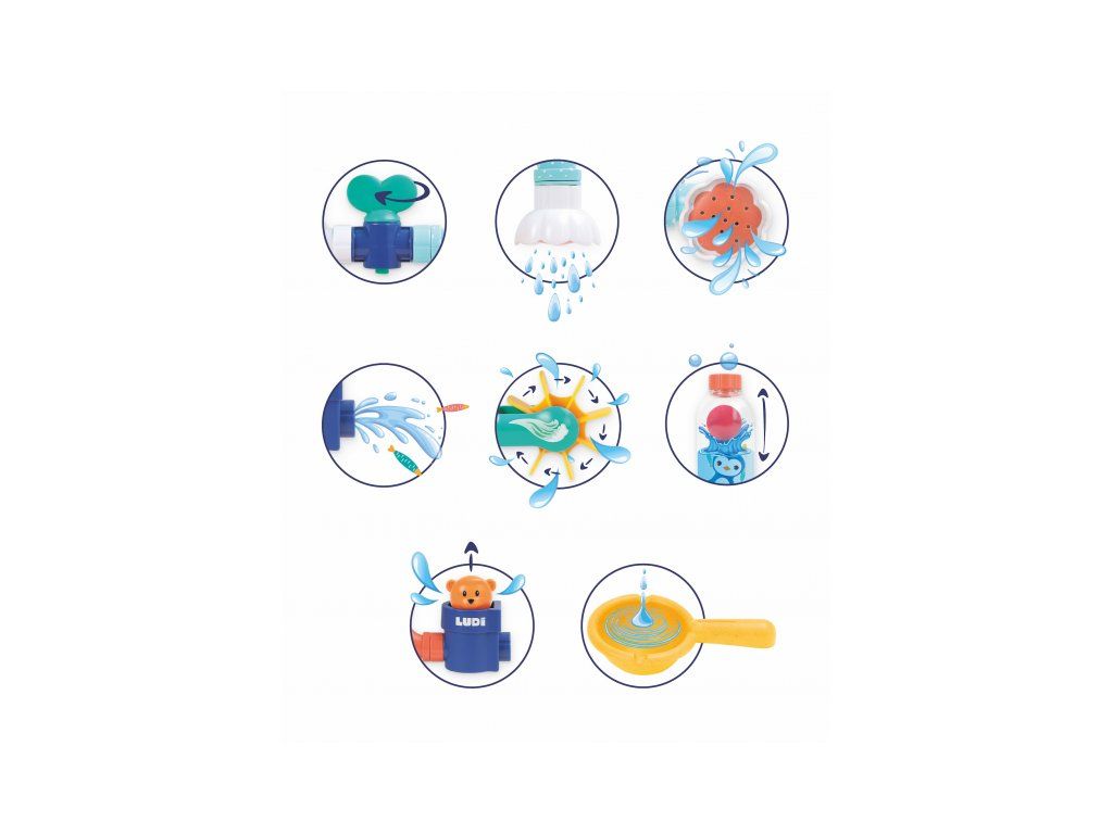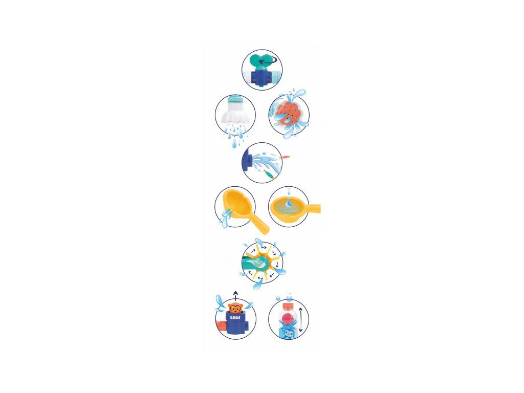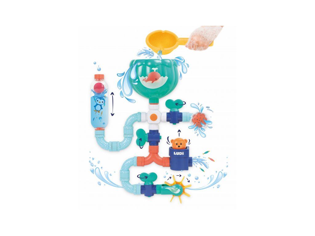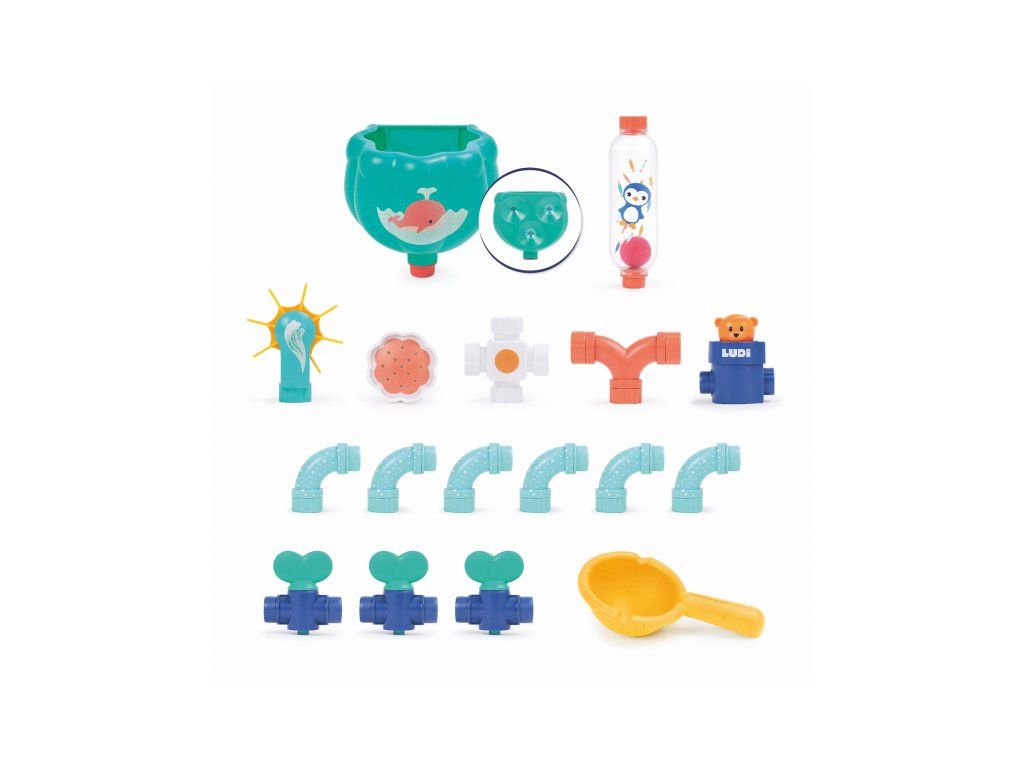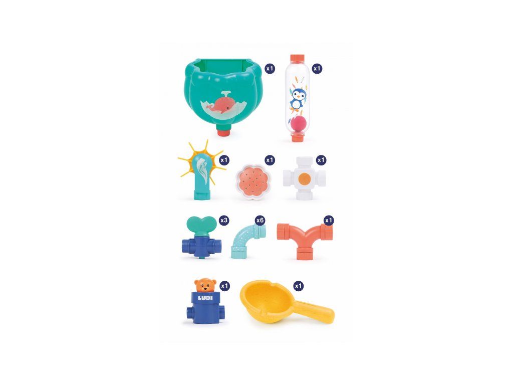 Obsah balení: nádrž s přísavkami, konektor, 3 vodovodní kohoutky, 6 trubek, dvojitá trubka, průhledný zásobník s míčkem, vodní mlýnek, vodní sprcha, medvídek, naběračka