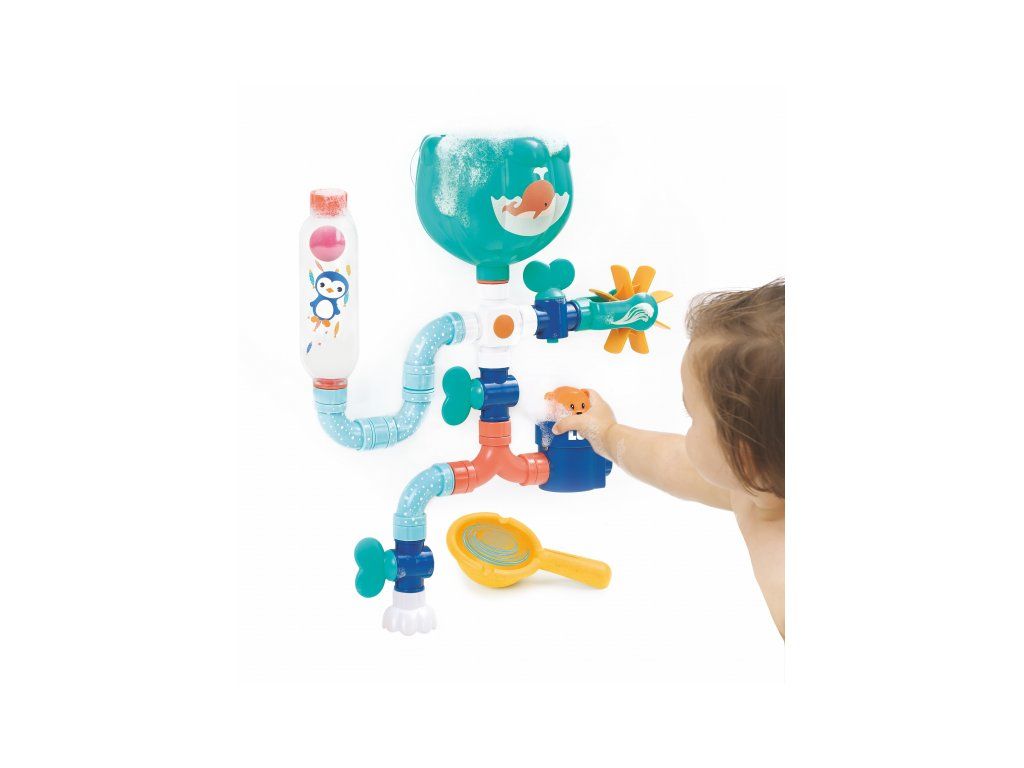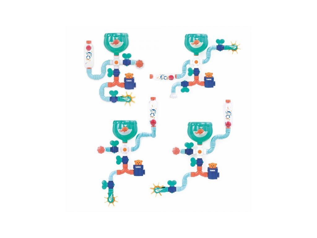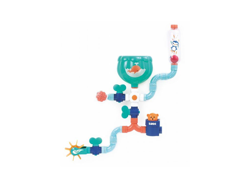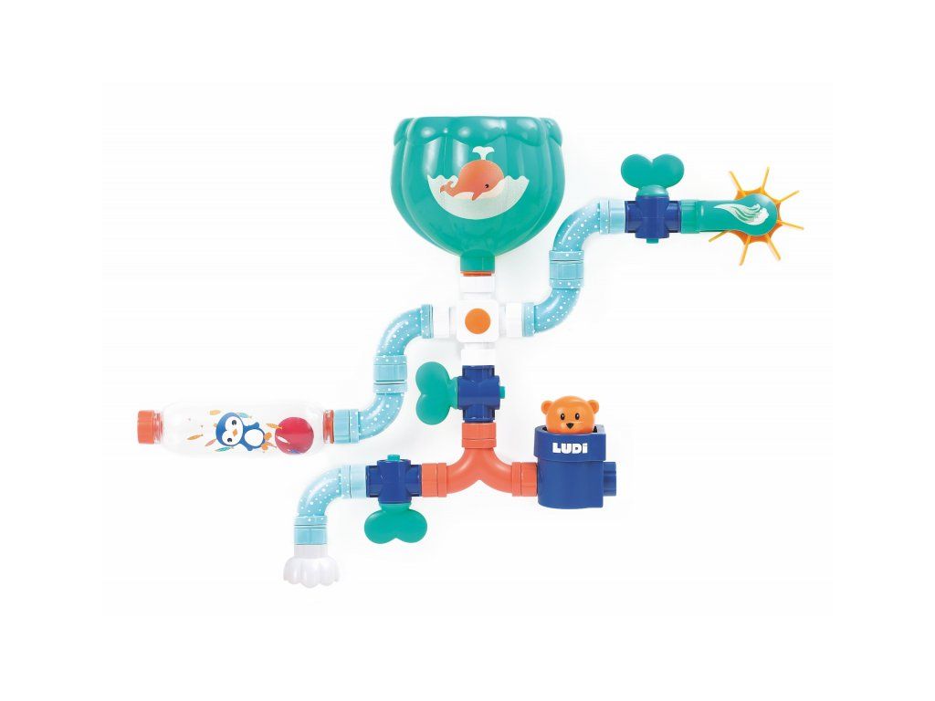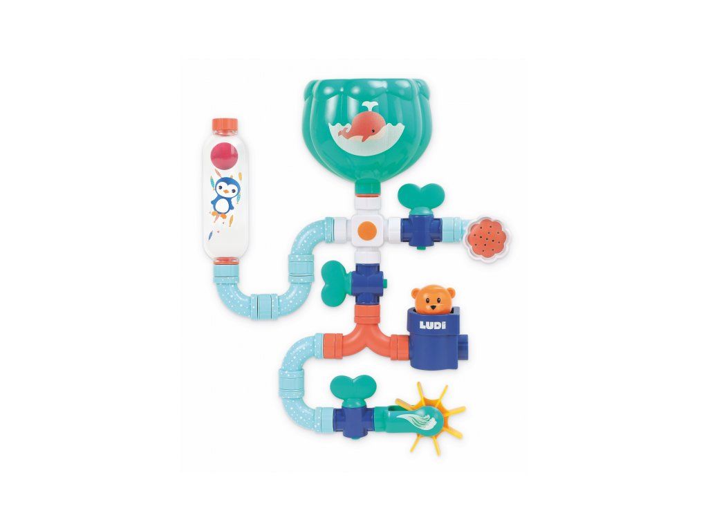 Obsah balení: nádrž s přísavkami, konektor, 3 vodovodní kohoutky, 6 trubek, dvojitá trubka, průhledný zásobník s míčkem, vodní mlýnek, vodní sprcha, medvídek, naběračka