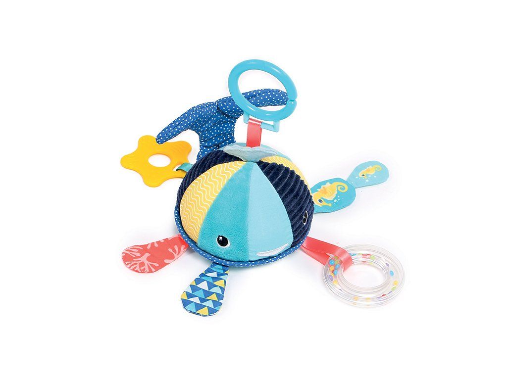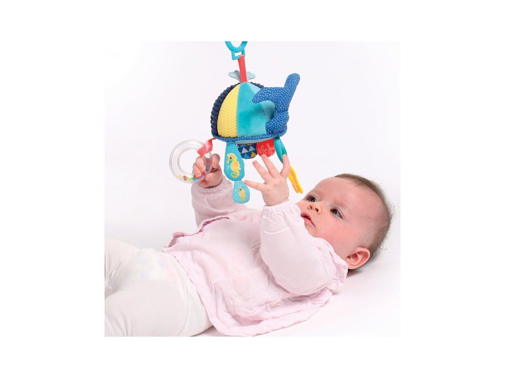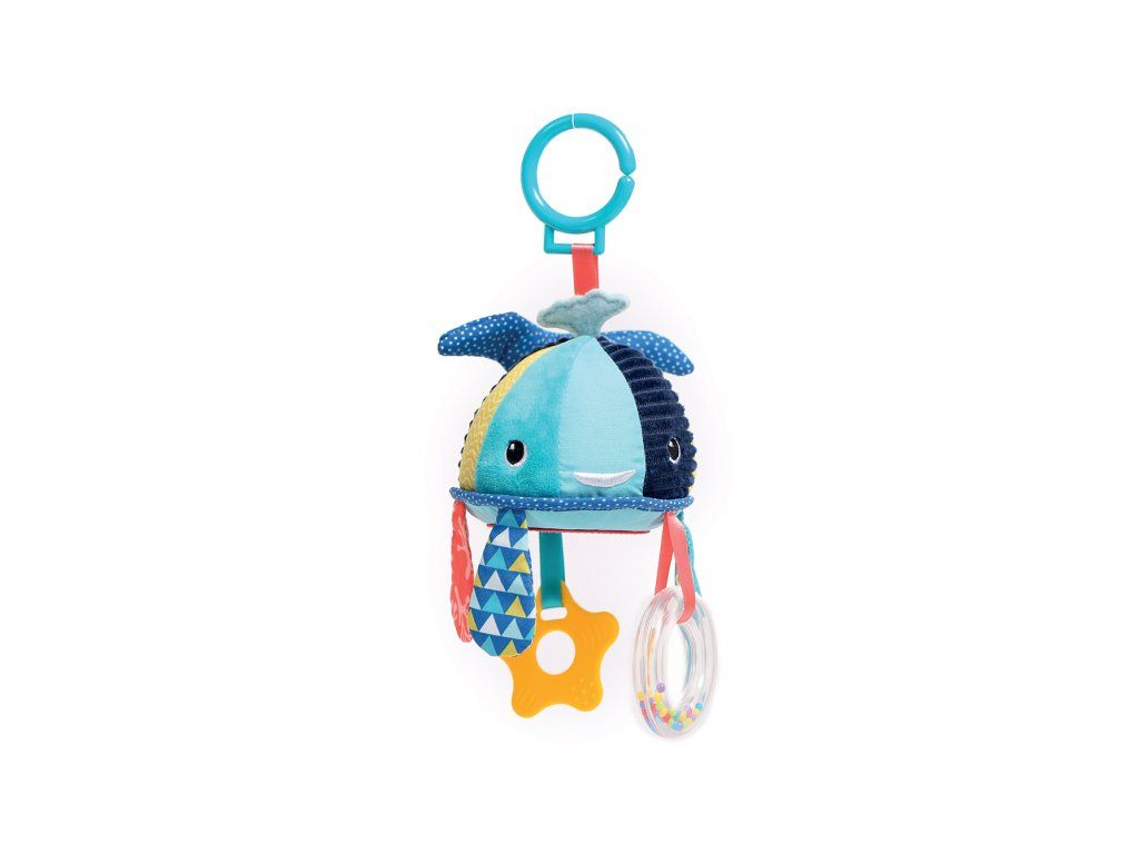 Závěsná hračka v podobě barevné velryby nabízí různé aktivity a textury pro zábavné hraní a zkoumání. Chrastítko s korálky, kousátko, bezpečné zrcátko, šustivé části, to vše pomáhá rozvíjet jemnou motoriku a jednotlivé smysly dítěte.