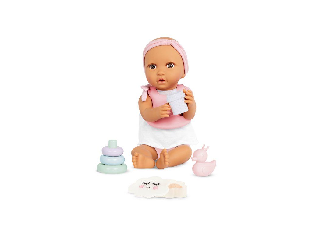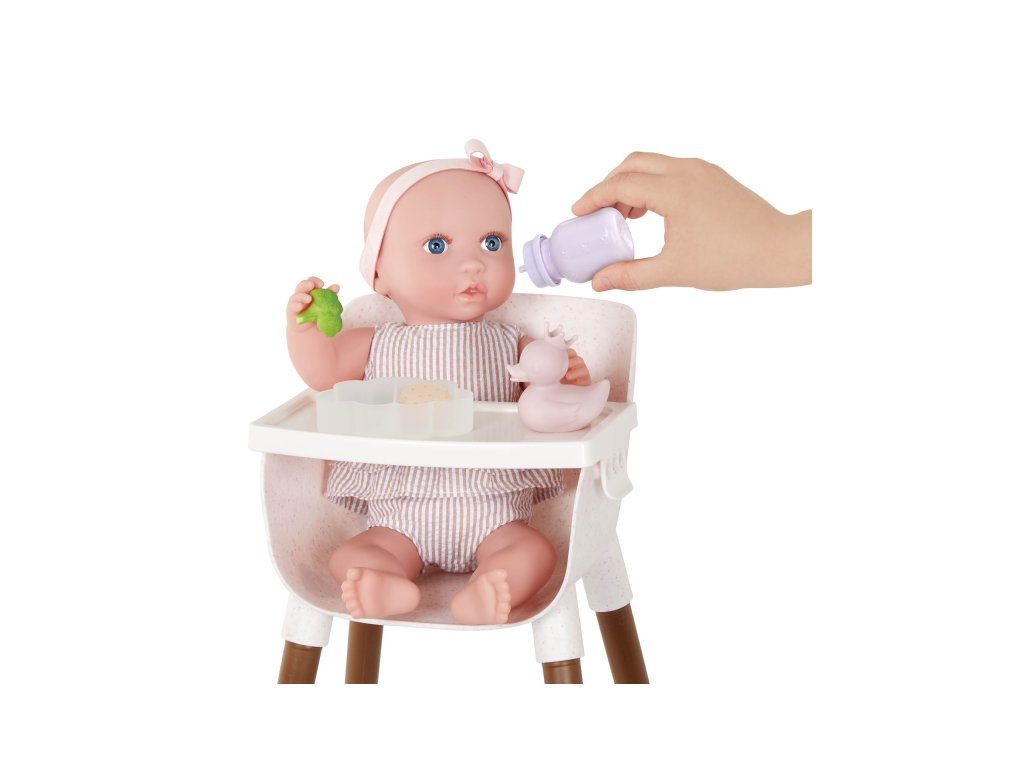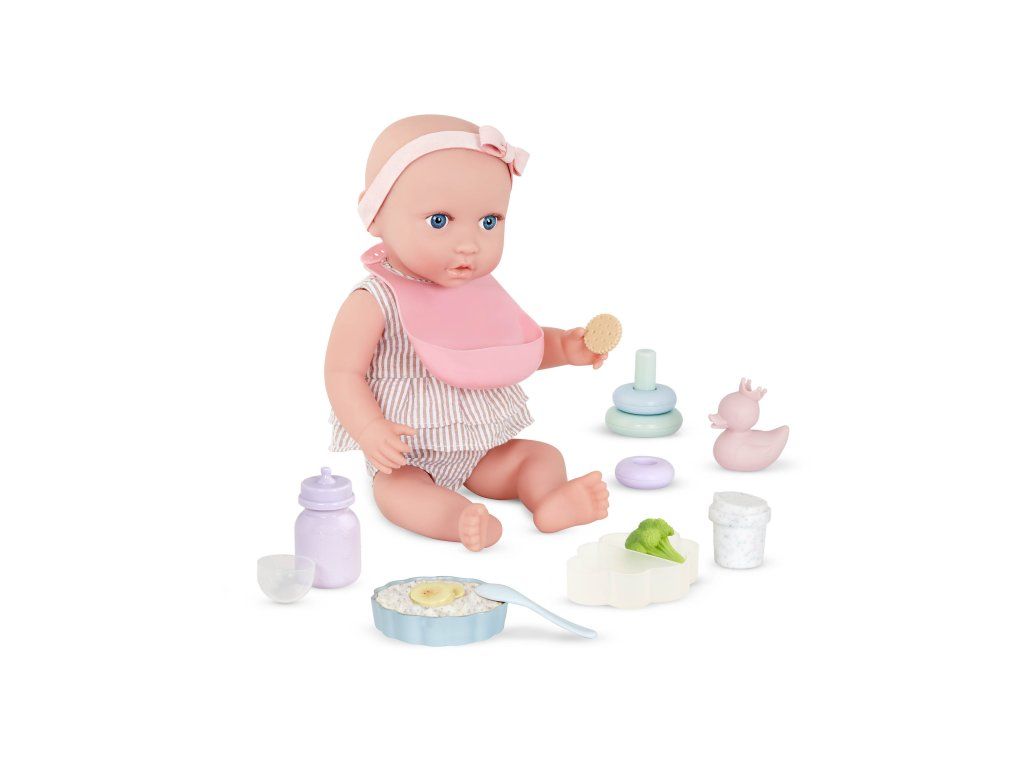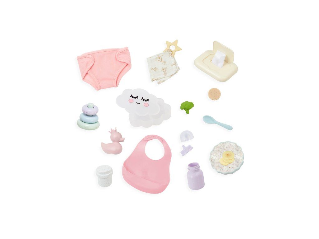 S touto sadou doplňků pro panenku se děti mohou postarat o nakrmení i přebalení své panenky jako skuteční rodiče. Sada obsahuje bryndáček, misku s jídlem (ovesná kaše, brokolice a sušenka), lahvičku s mlékem, hrneček, lžičku, 2 kroužky, kousátko, kachničku, plenku na přebalení, zásobník ubrousků a praktický úložný box ve tvaru obláčku. Děti si mohou vyzkoušet péči o miminko, rozvíjet přitom jemnou motoriku, představivost i sociální dovednosti.