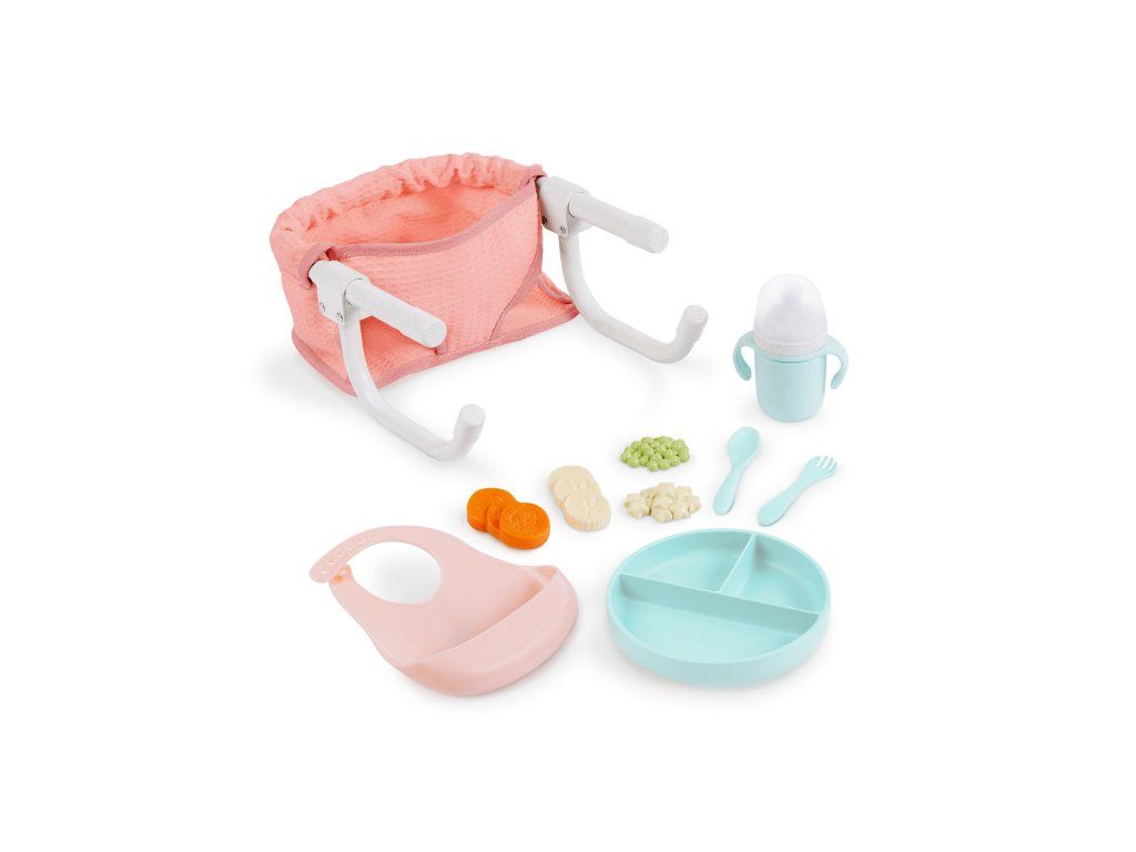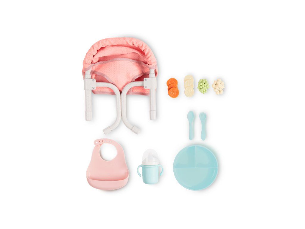 Sada obsahuje židličku, hrníček s odnímatelným víčkem, vidličku, lžíci, talíř, cereálie, hrášek, kolečka mrkve, kolečka banánů a bryndáček.