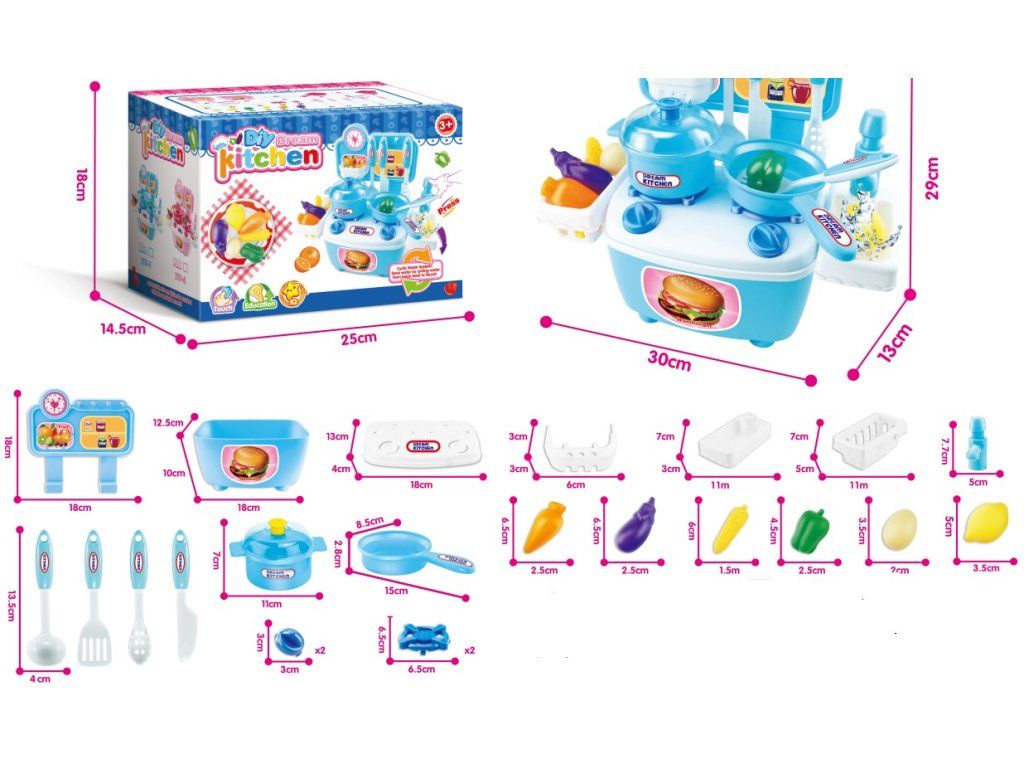 Mini kuchyňka, ve které se dá uvařit spousta dobrot. Rozměr kuchyňky 30x28x15 cm. Kuchyňka obsahuje malé nádobí, kuchyňské náčiní, makety potravin a další příslušenství.