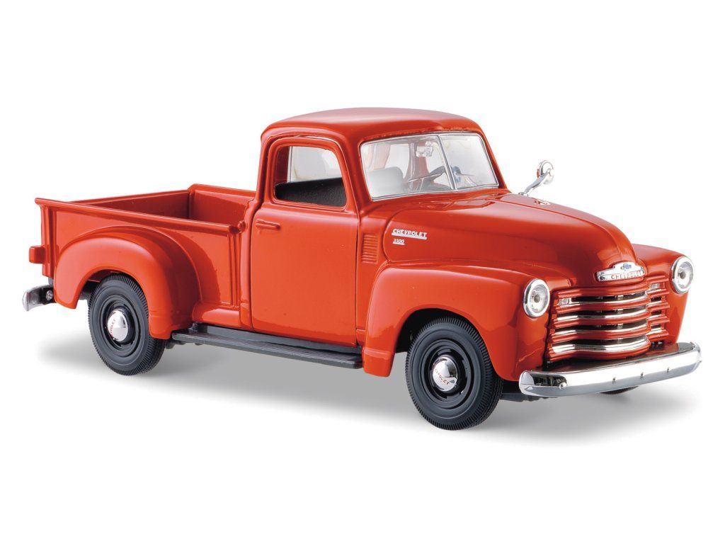 1950 Chevrolet 3100 Pickup, oranžový. Kovové modely Maisto v měřítku 1:25 patří mezi nejoblíbenější. Mají velmi dokonalé detailní provedení jednotlivých částí a kvalitní barevné provedení. Model má otevíratelnou přední kapotu a přední dveře. Baleno v krabičce. Nevhodné pro děti do 3 let. Rozměry balení: 22,8x10,5x11,4cm. Věk: 3+