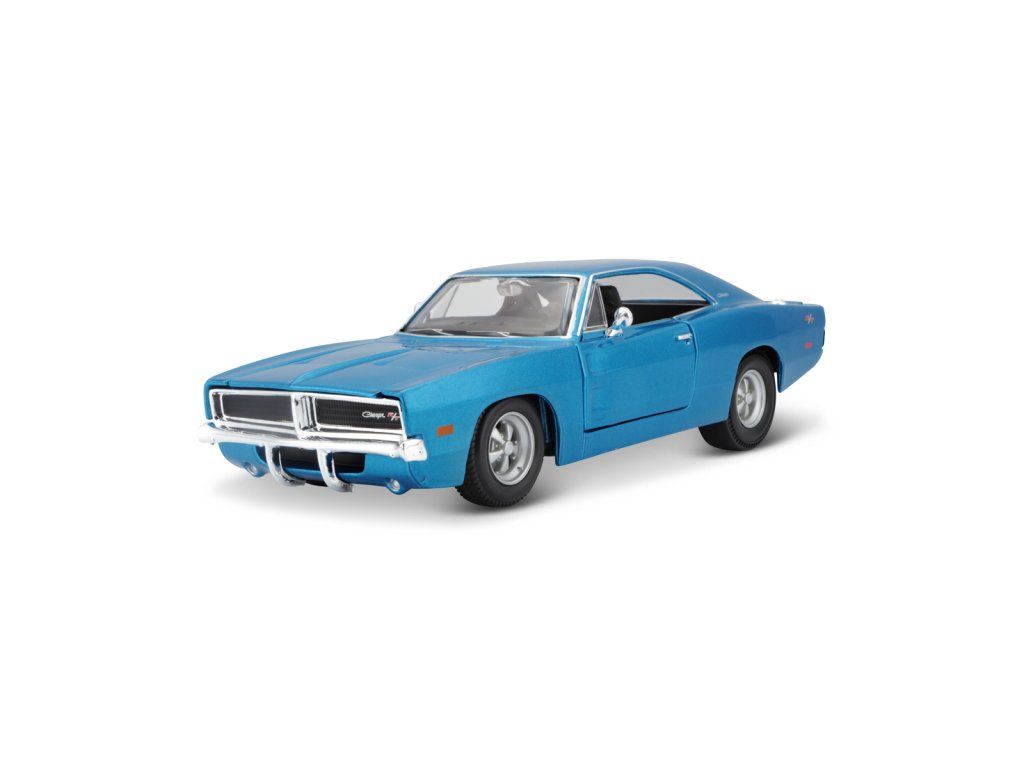 1969 Dodge Charger R/T, metalická modrá. Kovové modely Maisto v měřítku 1:24 patří mezi nejoblíbenější. Mají velmi dokonalé detailní provedení jednotlivých částí a kvalitní barevné provedení. Model má otevíratelnou přední kapotu a přední dveře. Baleno v krabičce. Nevhodné pro děti do 3 let. Rozměry balení: 22,8x10,5x11,4cm. Věk: 3+