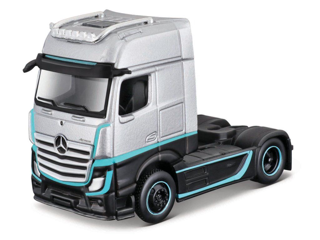 Mercedes-Benz Actros 1851, stříbrno-černý. Zcela nové kovové modely tahačů s plastovými doplňky. Modely mají gumová kolečka, otevírání přední kapoty, detailní provedení interiérů, včetně výrazného barevného provedení, které jim umožňuje vyniknout od ostatních modelů. Balení: 16,45 x 8,25 x 7,6 cm. Věk: 3+