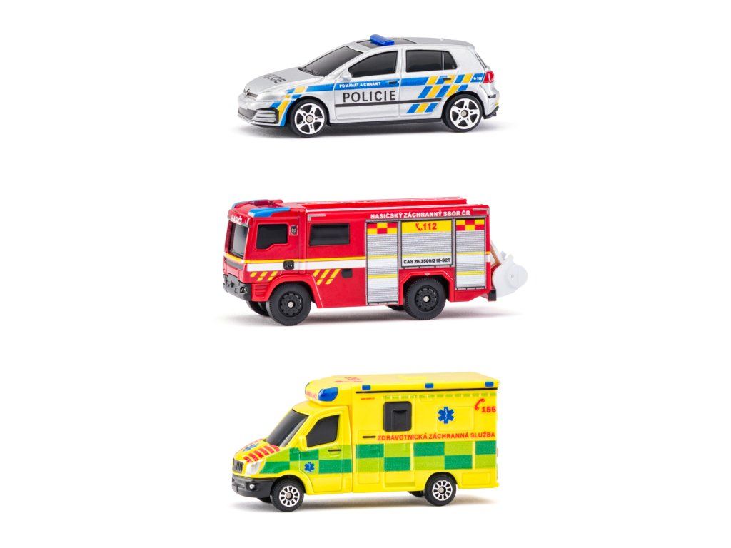 Sada záchranných vozidel v českém designu. Obsahuje hasičské auto, sanitku a policejní auto. Modely v měřítku 1:64. Rozměr balení: 10x30x4,5 cm. Věk 3+