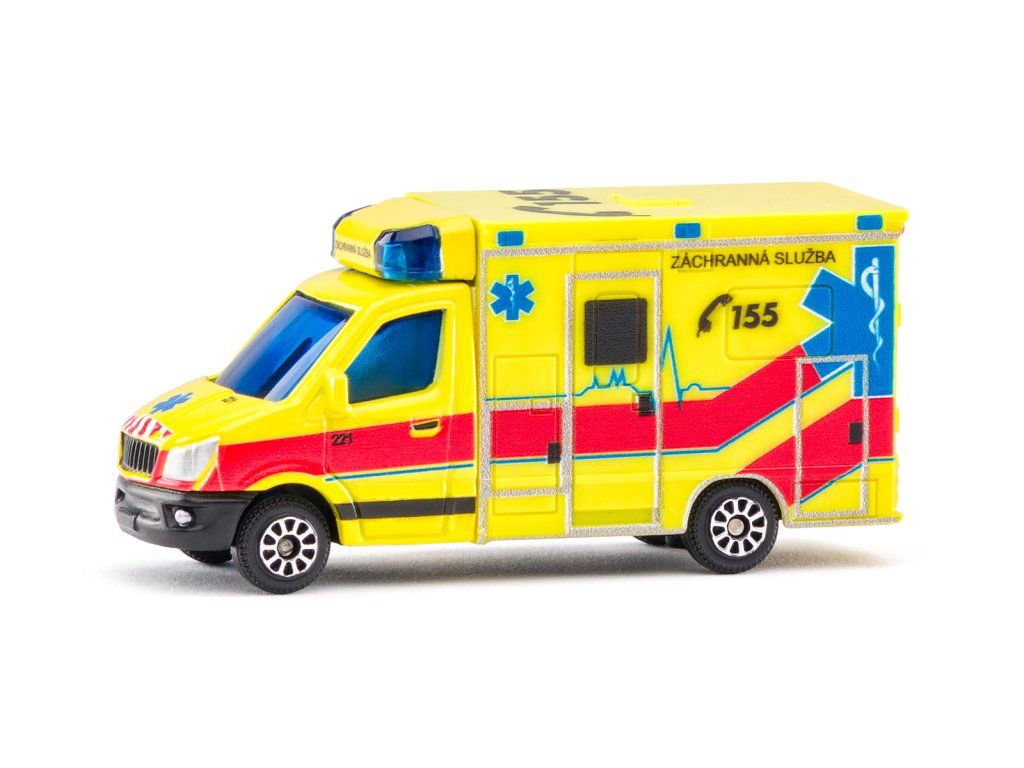 Model sanitky v českém designu. Sanitka má funkční světla a zvuky. Kovový model s plastovými díly v rozměru 3''. Funguje na 3xAG3 baterie, které jsou součástí balení. Rozměr balení: 11,5x14x5 cm. Věk 3+