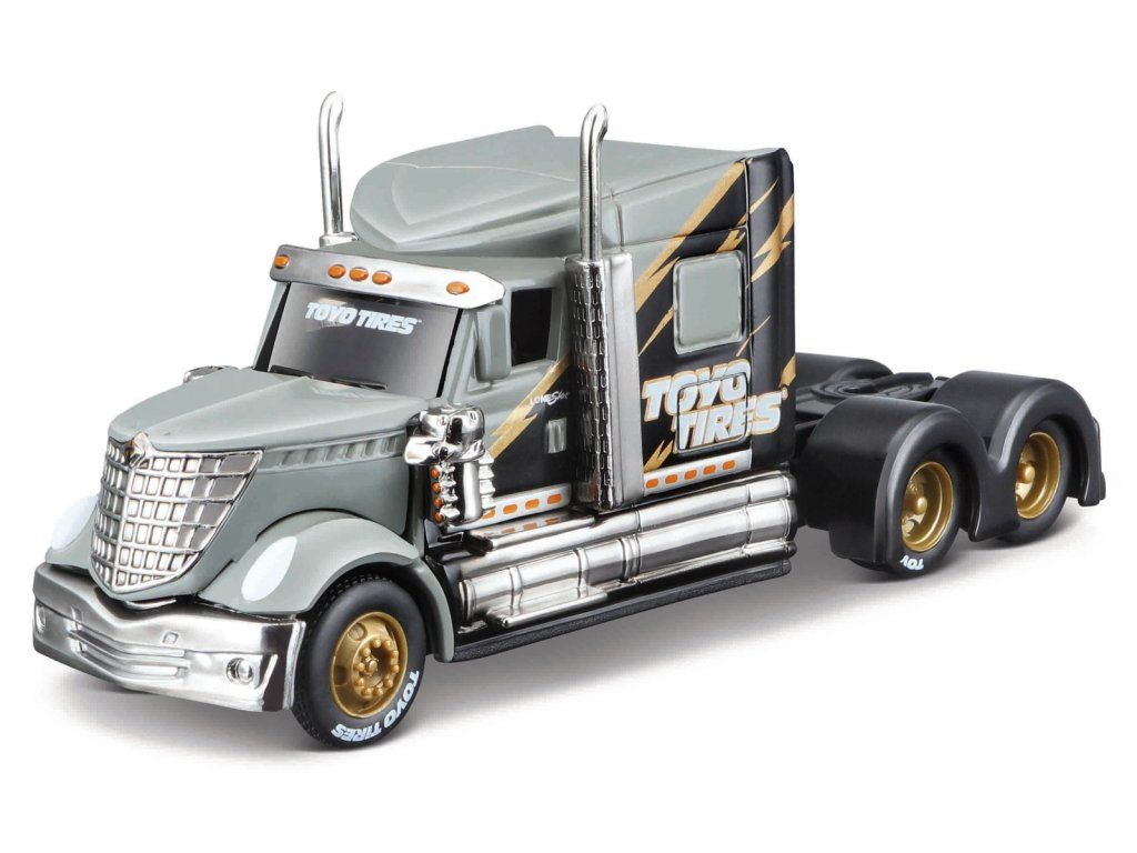 International Lone Star, šedé. Zcela nové kovové modely tahačů s plastovými doplňky. Modely mají gumová kolečka, detailní provedení interiérů, včetně výrazného barevného provedení, které jim umožňuje vyniknout od ostatních modelů. Balení: 16,4x8,2x7,6cm. Věk: 8+