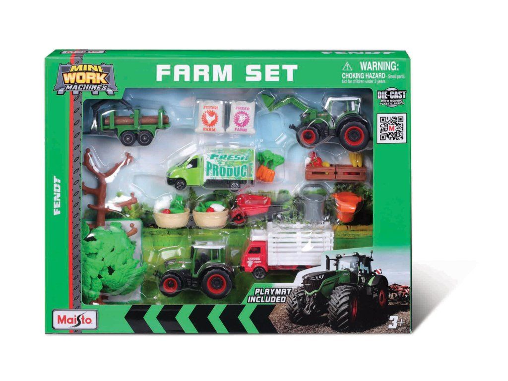 Malé pracovní stroje - Super farmářská sada Fendt. Super sada obsahuje: kovový model traktoru Fendt s plastovými detaily, přídavný traktor s radlicí, dodávku, transportér, přívěs, strom, zeleninu a další příslušenství pro sestavení vlastní farmy. Doplňky jsou vyrobeny z plastu. Součástí je i papírová hrací podložka o rozměru 29,7 x 21 cm. Model traktoru o velikosti 3'' (cca 7,5 cm) je vyroben z tlakově litého kovu. Rozměry balení: 23,2 x 20,49 x 4,45 cm. Věk: 3+