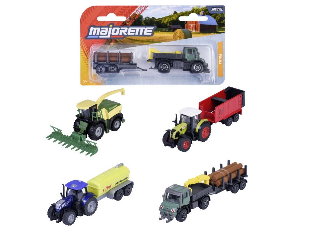 Farmářské kovové vozidlo s volnoběžkou, pohyblivými a/nebo otevíracími díly. 4 druhy - traktor s přívěsem, traktor s cisternou, kombajn, nakladač dřeva s valníkem. Délka 13 cm.