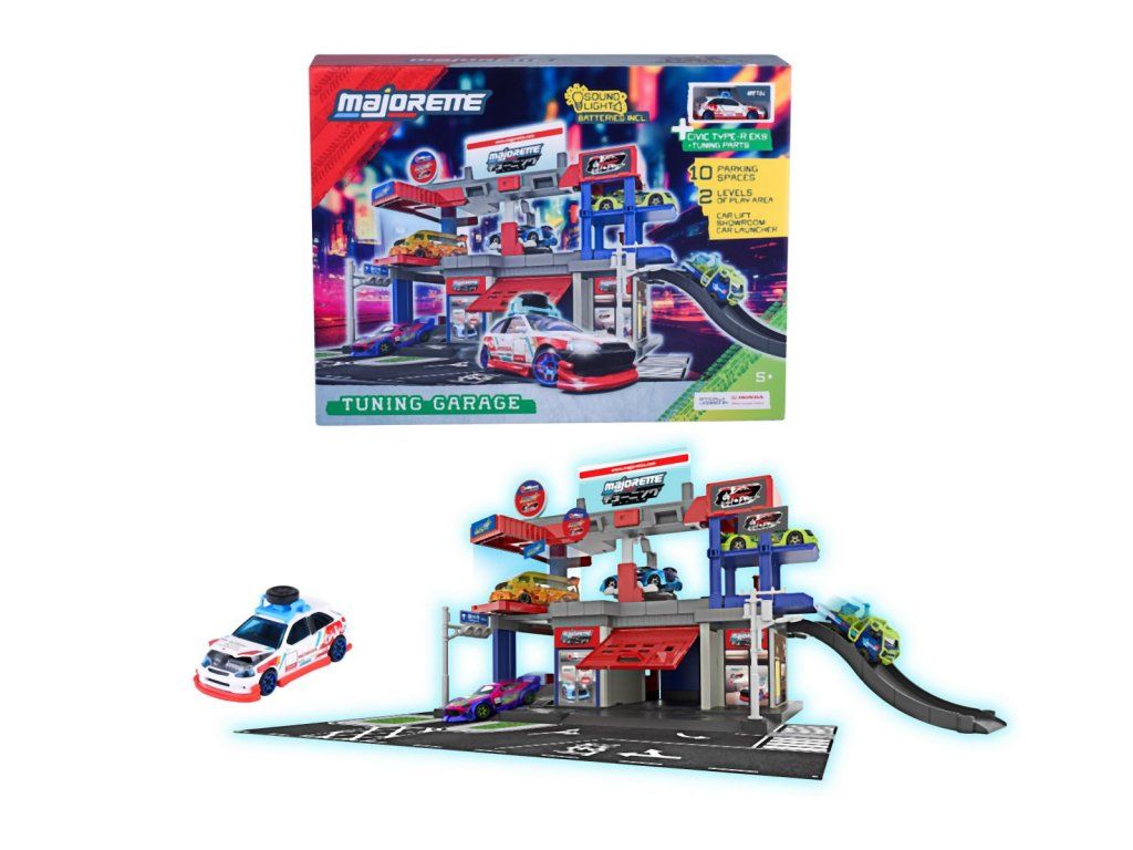 Tuningová garáž Majorette má 2 podlaží, čerpací stanici, manuálně ovládaný výtah a světelné i zvukové efekty, zvedací plošinu, tuningovou část a 10 parkovacích míst. Jedno autíčko 7,5 cm je součástí. Rozměry po sestavení: 35,5 x 45,5 x 23,5 cm.