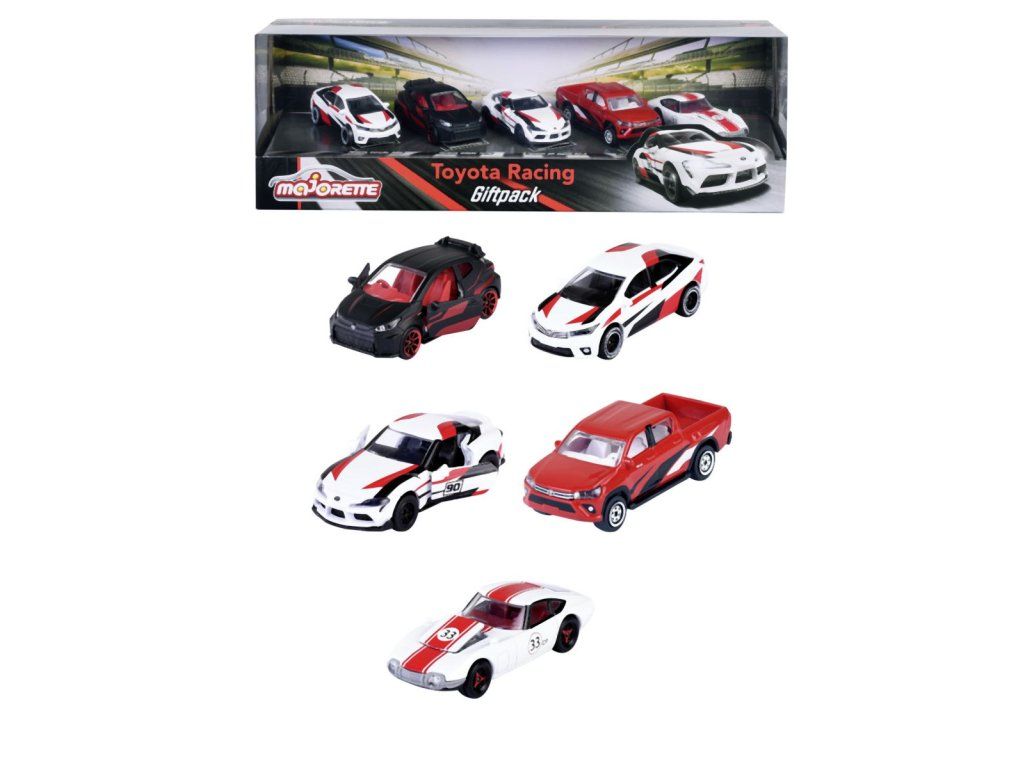 Dárková sada kovových autíček z kolekce Toyota Racing s volnoběhem, otevírací části. Balení obsahuje 5 ks: Toyota GR Supra, Toyota GRMN Yaris, Toyota Hilux Revo, Toyota Corolla Altis, Toyota 2000 GT v barvě černé, bílé a červené. Délka autíčka 7,5 cm. V měřítku 1:64.