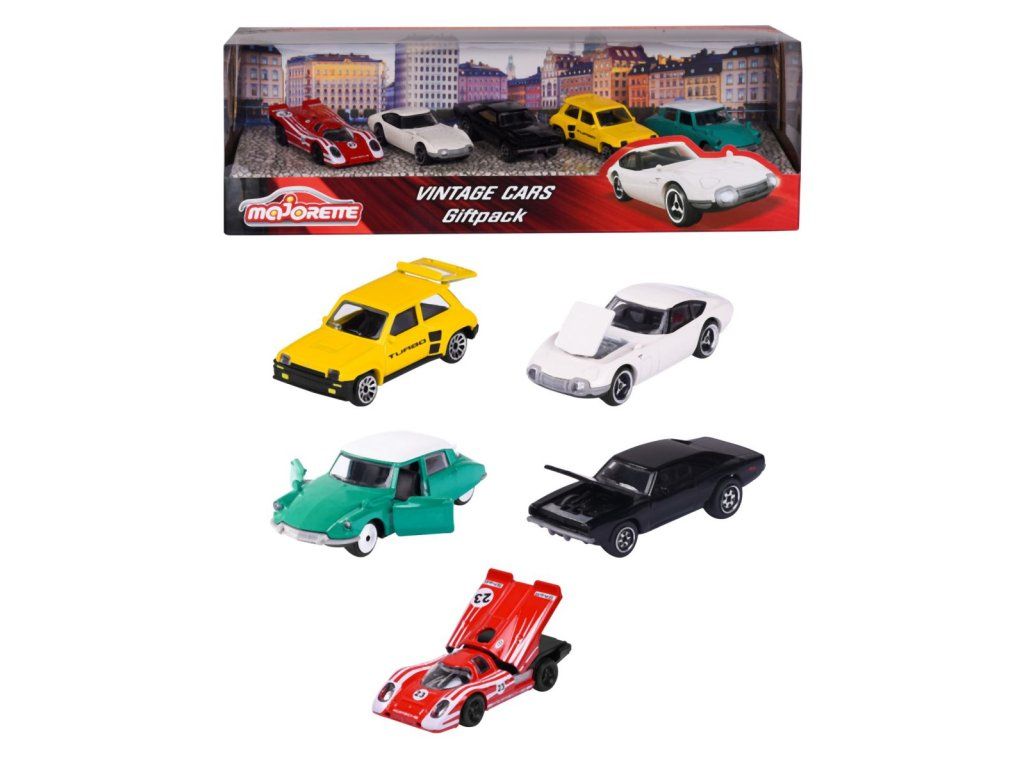 Dárková sada kovových autíček v retro stylu s volnoběhem. Balení obsahuje 5 ks: Citroën 2CV, Porsche 934, Renault 5 Turbo, VW Beetle a GT Toyota Celica černá. Délka 7,5 cm.