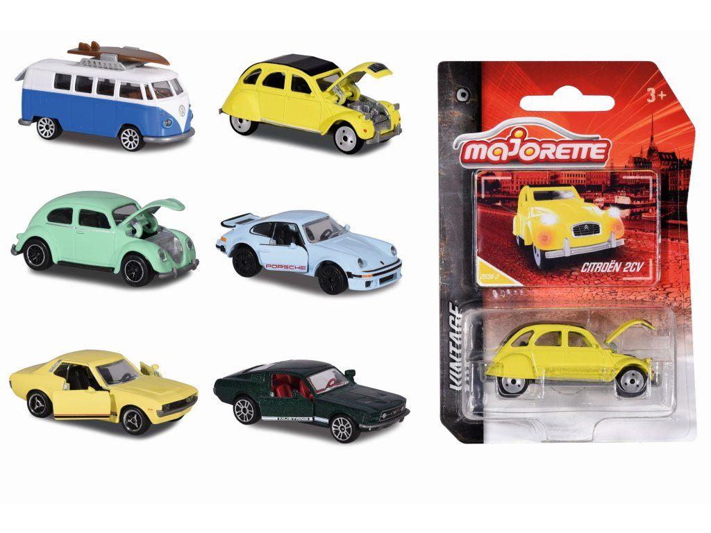 Kovové autíčko ve vintage stylu na volnoběh. S otvíracími částmi. Včetně sběratelské kartičky. 6 druhů: Ford Mustang, Porsche 934, Renault Alpine A110, Citröen 2CV, VW Beetle nebo VW T1. Délka autíčka 7,5 cm.