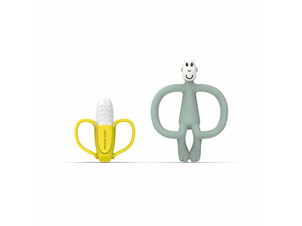 Dárková souprava kousátek - banán a opice - je ideální pro každé miminko, které vykazuje první známky prořezávání zoubků. Zábavná savička ve tvaru banánu se snadno drží malými ručičkami a její textura je ideální na masírování čerstvě prořezaných dásní. Následně přejděte na klasické kousátko opice pro aplikaci přípravků na prořezávání zoubků na těžko dostupné stoličky.