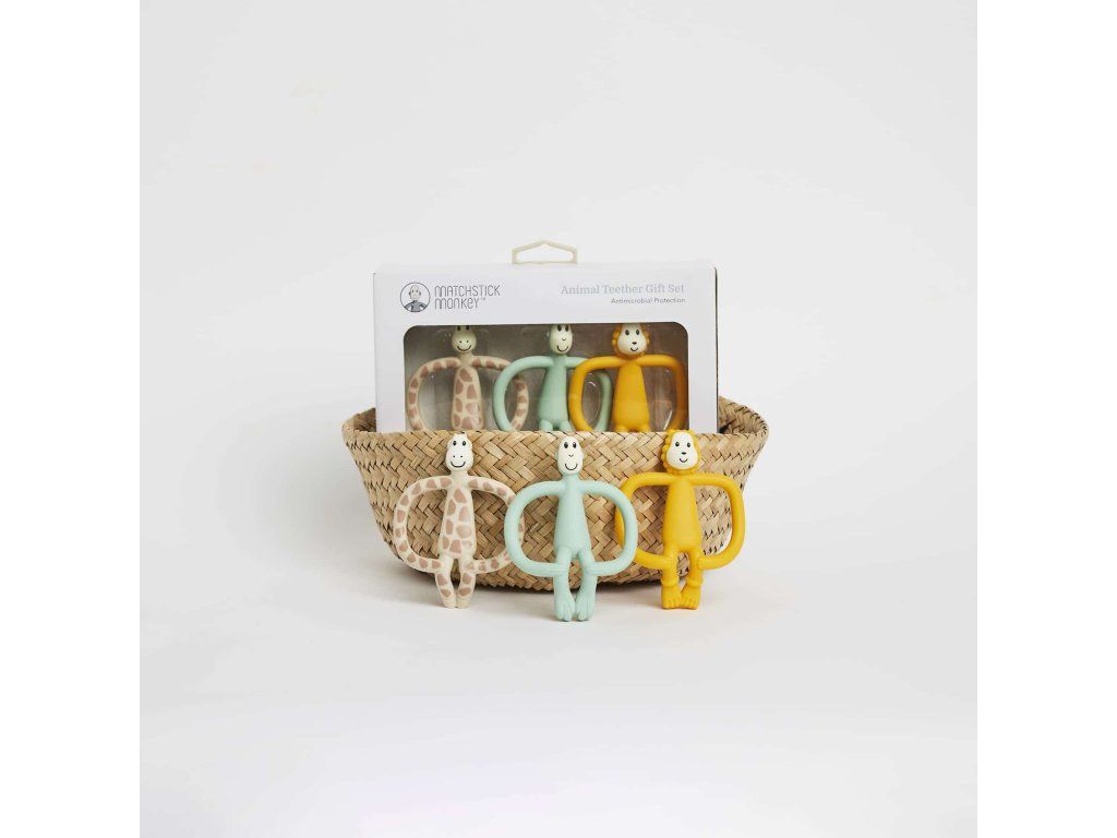 Získejte nyní 3 oceněná kousátka Matchstick Monkey – žirafu Gigi, lva Ludu a opičku v mátově zelené barvě jako sada 3 v 1!