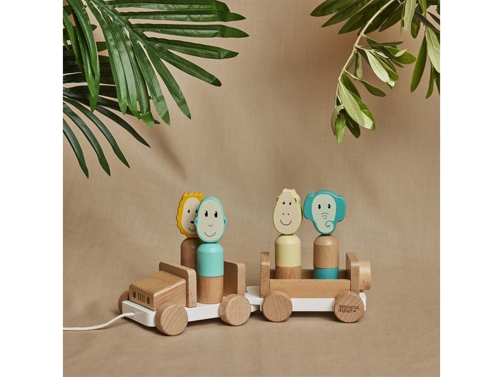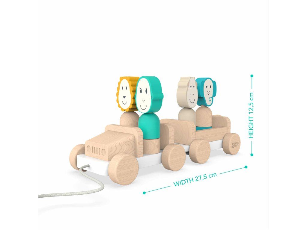 Tato dřevěná hračka rozvíjí jemné motorické dovednosti vašeho dítěte a koordinaci rukou a očí, když se učí, jak skládat dílky různými způsoby, a zároveň podporuje rozpoznávání zvířat. Díky bavlněné šňůrce může dítě táhnout džíp po svém vlastním safari.