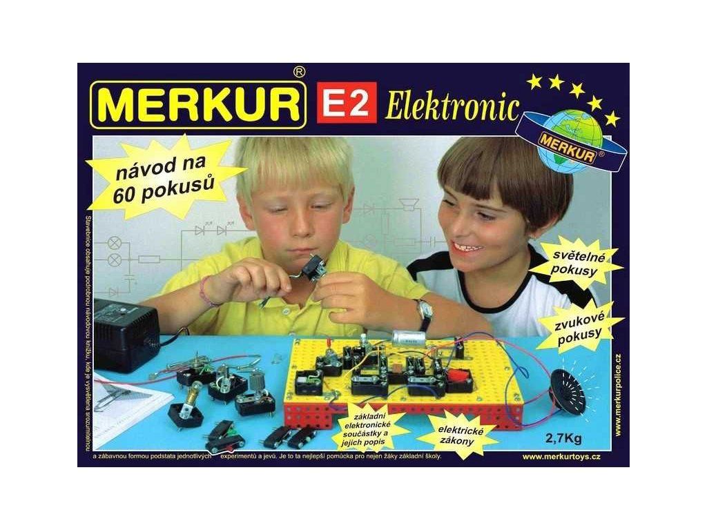 Se stavebnicí Merkur E2 electronic můžeme vyzkoušet 60 pokusů z elektroniky - např. elektrický obvod, pokusy s rezistory, kondenzátory a diodami atd. Je možné sestavit jednoduché i složitější obvody, jako například tranzistorový spínač, blikače, bzučáky a zesilovač. Stavebnice obsahuje podrobnou knížku s návody, kde se zábavnou formou vysvětluje podstata jednotlivých experimentů a jevů. Návod je v českém jazyce. Univerzální zdroj 3 - 12 V není součástí stavebnice. Rozměr balení: 36 x 27 x 5 cm. Nevhodné pro děti mladší 3 let. Věk: 10+
