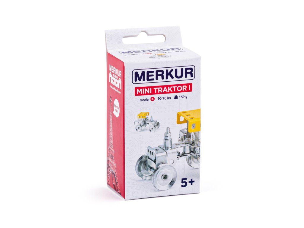 Startovací mini stavebnice Merkur, ze které je možné sestavit 1 model-traktor. Ideální pro trénink jemné motoriky a představivosti. Vhodné i pro děti, které s Merkurem začínají, ale i pro sběratele. Se sestavenými modely se dá hrát, jsou velmi odolné. Stavebnice obsahuje 70 dílků.| Rozměr balení: 5x9,5x4,5 cm | Věk: 5+| Rozměr modelu: 8,5x5,5x5 cm. Nevhodné pro děti mladší 3 let | Váha: 150 g
