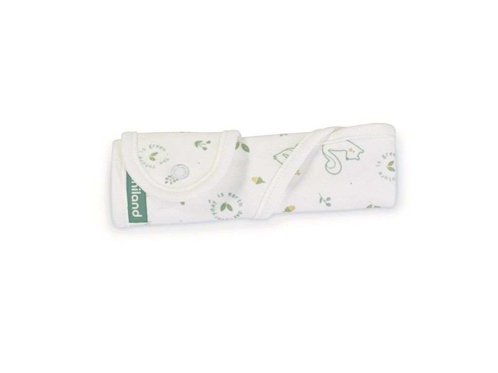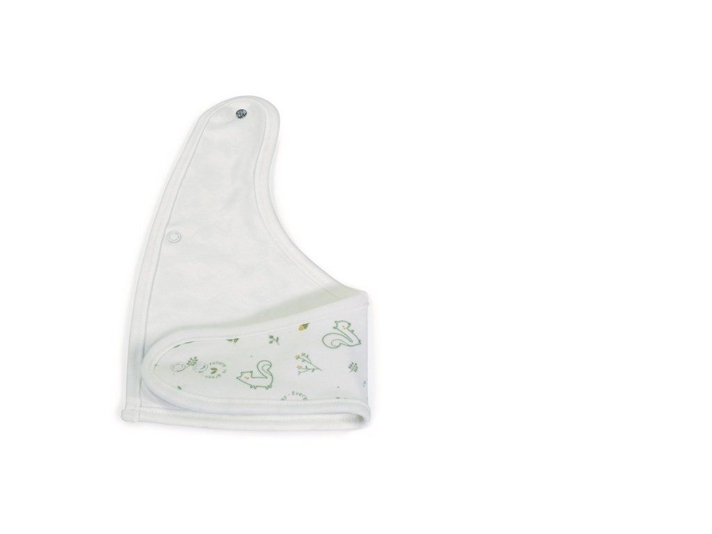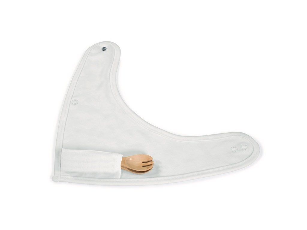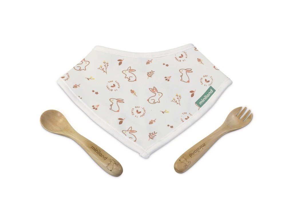 Lžička a vidlička mají zaoblené bezpečné tvary a kulatá držadla, které usnadňují dítěti držení. Zástěrka s něžným potiskem králíků je na vnitřní straně vybavena kapsou, do které můžete vidličku a lžičku zabalit.