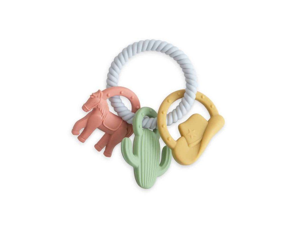 Kousátko Mushie s motivem divokého západu je navrženo tak, aby stimulovalo smyslové vnímání a zmírnilo nepříjemné pocity při prořezávání zoubků.