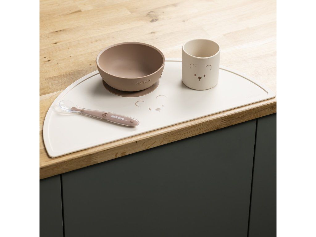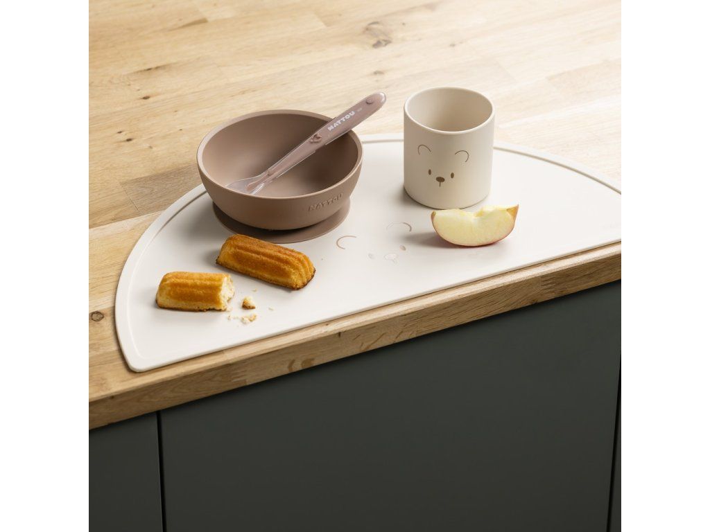S touto elegantní silikonovou jídelní soupravou může vaše děťátko jíst bez obav. Zvýšený okraj talíře a přísavná podstava zabraňují vylévání jídla na zem. Lžička je dokonale přizpůsobena malým ručičkám a ústům miminek a malých dětí, takže se stává ideálním pomocníkem při krmení a učení se samostatnosti.