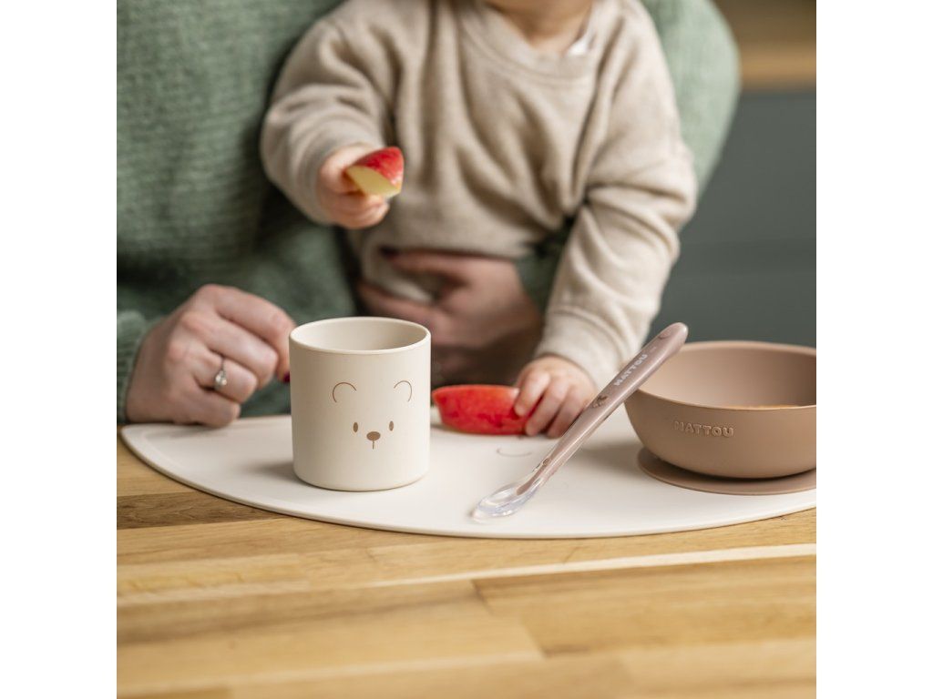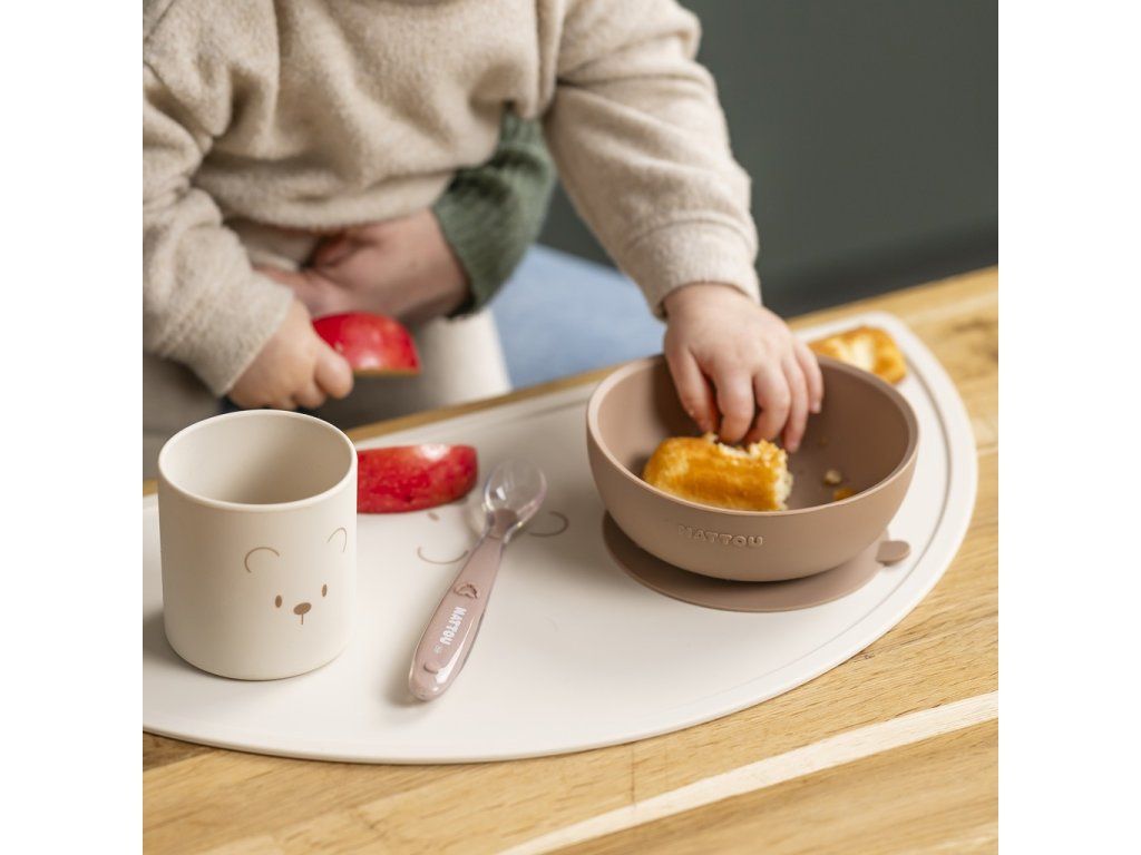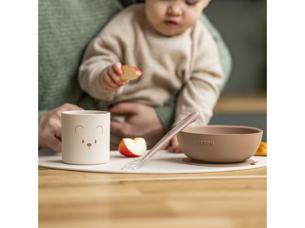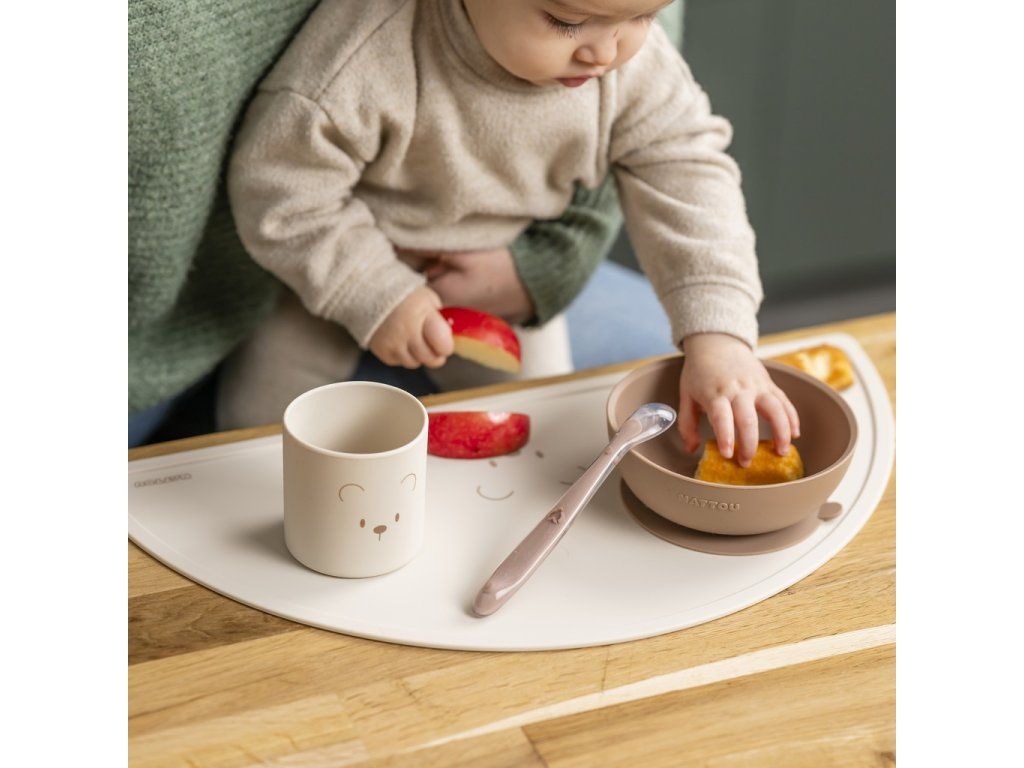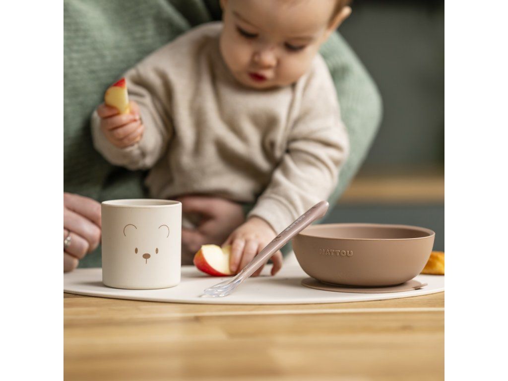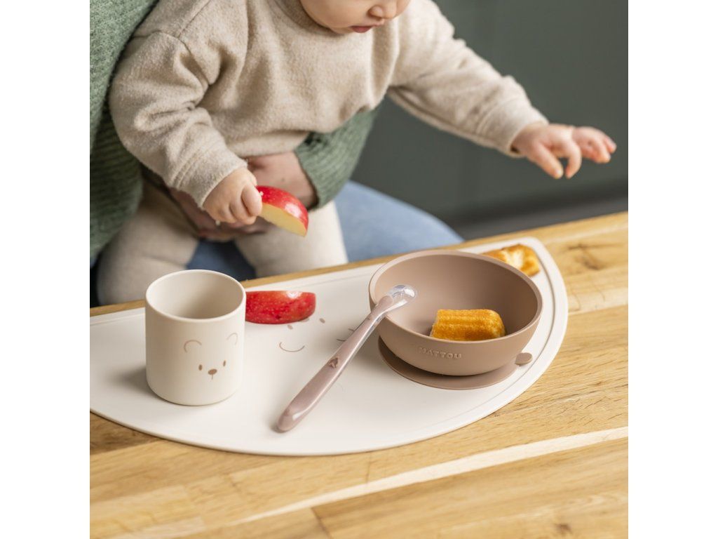 - Jídelní souprava pro miminka a malé děti: talíř, miska, pohár a lžička z měkkého silikonu.