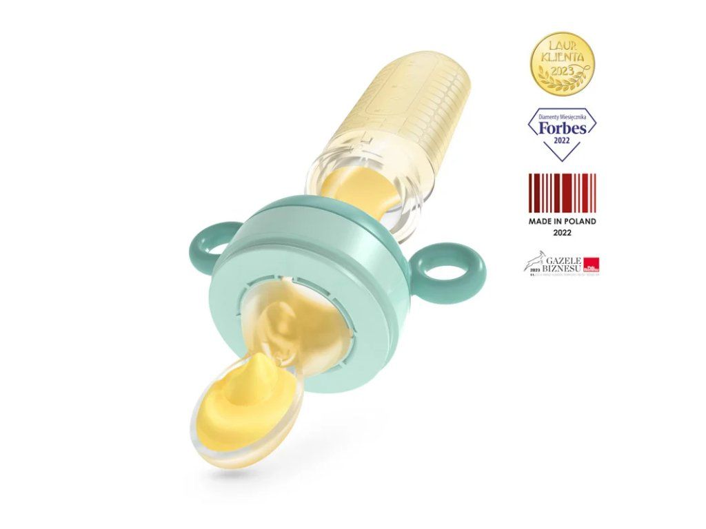 - Ovocné pěny nebo husté polévky jsou součástí dětského jídelníčku. Nástavec lžičky, který je součástí soupravy, umožňuje dítěti vyzkoušet si je s pomocí rodiče nebo samostatně.