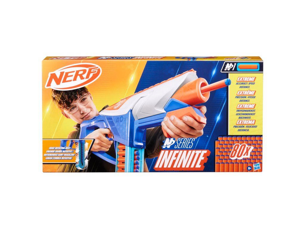 Pistole Nerf N Series Infinite od Hasbro, se kterou jen tak nějaká hra neomrzí. Blaster s vysokou kapacitou. Inovativní design bojového pásu pro snadné a rychlé nabíjení - pás pojme 40 šipek. Možnost rychlého výstřelu několika šipek za sebou nebo pomocí mechanismu pump action. Obsahuje 80 šipek. Hra s Nerf podporuje spolupráci, rychlé rozhodování a přesnou mušku. Hra s pistolí zajistí neopakovatelnou atmosféru a pořádnou dávku zábavy. Vyrobeno z kvalitního plastu. Při hraní se doporučuje, aby děti použily ochranné brýle (nejsou součástí balení). Rozměr balení: 34,29 x 66,04 x 8,09 cm. Vhodné od 8 let.
