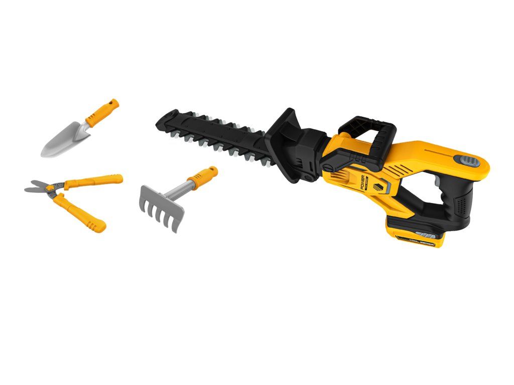 Nůžky na živý plot s příslušenstvím jsou ideální pro malé zahradníky, kteří se chtějí starat o své zahrady. Sada obsahuje: nůžky na živý plot, zahradní nůžky, hrábě, lopatku. Zvukové a světelné efekty. Přepínač ON/OFF v rukojeti. Přepínač normálního a zpětného chodu nad rukojetí. Simulace odpojení bateriového modulu. Funguje na 3xAA baterie, které nejsou součástí. Rozměry nůžek: 20 x 58 x 8,5 cm. Rozměry balení: 22,6 x 58,6 x 8,7 cm. Věk: 3+
