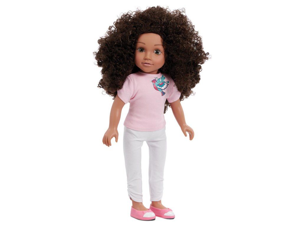 Pozdravte se s Miou, 46 cm vysokou panenkou, s nádhernými tmavě hnědými, kudrnatými vlasy, dlouhými 33 cm. Mia miluje čas strávený se svými přáteli. Ráda poslouchá hudbu a píše své vlastní písně. Miluje tanec a ráda navštěvuje koncerty a trampolínový park. Když je pěkné počasí, najdete Miu venku, jak jezdí v parku na kole. Mia je oblečena v měkkém růžovém tričku s potiskem ptáků, v bílých legínách a růžovo-bílých balerínkách. Panenku lze snadno převlékat. Dlouhé, realistické vlasy lze upravovat do copánků. Inspiraci a návody na účesy najdete v přiložené brožuře. Rozměr balení: 50 x 23 x 11 cm. Věk: 3+