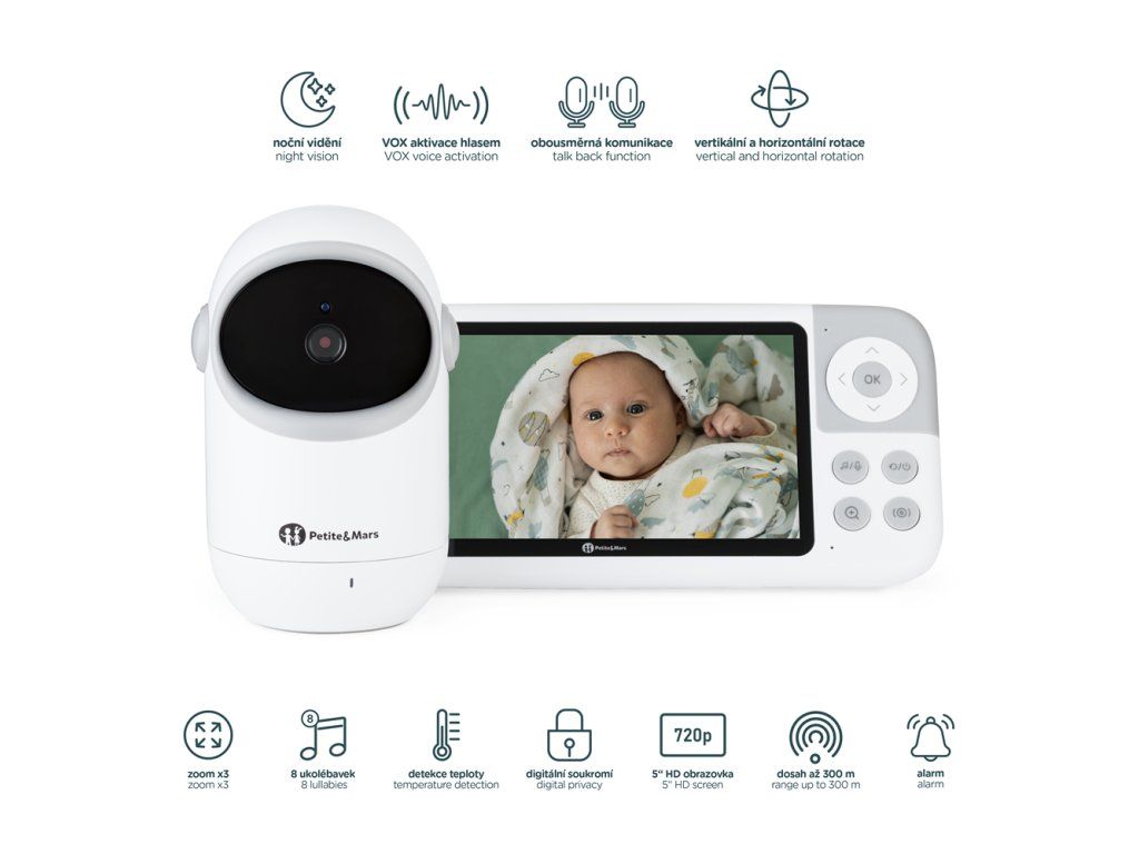 Chůvička je vybavena kamerou s možností dálkového ovládání, takže máte obraz vždy pod kontrolou, ať se dítko pohne kamkoli. Systém je rozšiřitelný až na 4 kamery, což z něj činí ideální řešení pro více místností nebo pro více dětí.