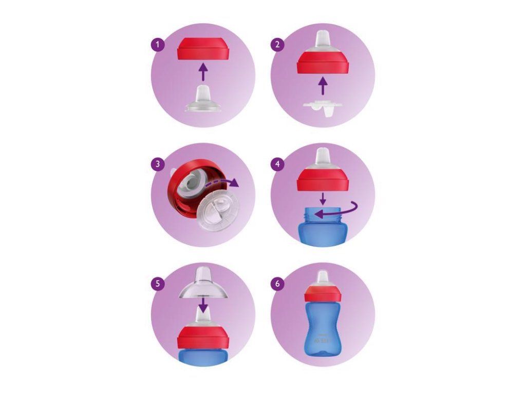 Varování – Před každým použitím hrnek s náustkem zkontrolujte. Pokud objevíte jakoukoliv prasklinu nebo poškození, okamžitě přestaňte používat. – Tento výrobek vždy používejte pod dozorem dospělé osoby. – Trvalé a dlouhodobé pití tekutin způsobuje zubní kaz. – Nedoporučujeme používat pro ohřívání tekutin nebo pokrmů mikrovlnnou troubu. Mikrovlnné trouby mohou pozměnit kvalitu potravin/nápojů a zničit některé cenné živiny a mohou v určitých místech vytvářet vysoké teploty. Při ohřívání jídla v mikrovlnné troubě proto dbejte na zvýšenou opatrnost. Když ohříváte tekutiny nebo jídlo v mikrovlnné troubě, vkládejte do ní pouze nádobu bez těsnicího kroužku, náustku a bez víčka. Ohřáté jídlo vždy promíchejte, abyste zajistili rovnoměrné rozložení tepla. – Před krmením vždy zkontrolujte teplotu pokrmu. – Nedovolte dítěti, aby si hrálo s malými částmi nebo aby při používání lahví a hrnků chodilo či běhalo. – Všechny části, které nepoužíváte, udržujte mimo dosah dětí. Upozornění – Před prvním použitím rozeberte všechny části a důkladně je umyjte a sterilizujte. Díly hrnku s náustkem dejte na 5 minut do vařící vody. Tím zajistíte nezbytnou hygienu. – Hrnky s náustkem můžete sterilizovat i v elektrickém sterilizátoru nebo sterilizátoru do mikrovlnné trouby. Sterilizaci jakékoli části hrnku s náustkem v mikrovlnné troubě provádějte jedině použitím vhodného sterilizátoru nebo sterilizačních sáčků (SFC297) Philips AVENT. – Před podáním hrnku s náustkem dítěti vždy zkontrolujte, zda jsou všechny části správně sestavené. – Tento hrnek s náustkem je určen pro řídké nápoje. Nejlepšími nápoji pro dítě jakéhokoli věku jsou voda a mléko. – Husté či perlivé nápoje nebo nápoje obsahující dužinu mohou ucpat ventil a způsobit jeho rozbití nebo netěsnost. – Hrnek s pítkem není určen k přípravě kojenecké výživy. Hrnek s pítkem nepoužívejte k míchání ani protřepávání kojenecké výživy, protože by mohlo dojít k ucpání otvorů a následné netěsnosti hrnku. Víčko hrnku s pítkem příliš neutahujte. – Pítko nepoužívejte jako dudlík. – Hrnek s pítkem nepoužívejte se skleněnými lahvemi. – Nevkládejte hrnek s pítkem do mrazničky. – Abyste se nepopálili, nechte horkou tekutinu před naplněním hrnku s pítkem vychladnout.