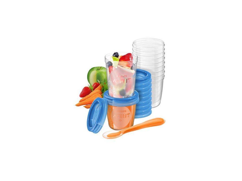 Avent VIA jídelní sada pro batolata s novými VIA kelímky pro uskladnění stravy či mléka v chladničce nebo mrazničce. Dítě lze krmit přímo z VIA kelímků.