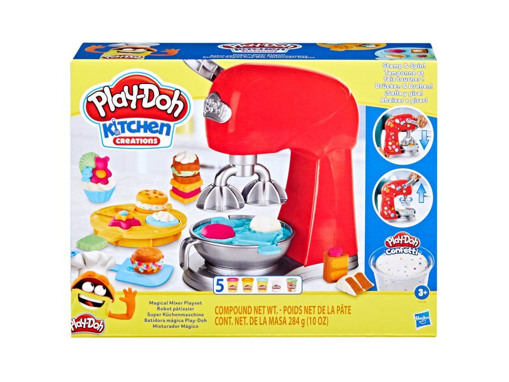 Tato sada nabízí vše potřebné k vytváření dortů, koláčků a sušenek z modelíny Play-Doh, a to vše bez nepořádku a horké trouby. V herní sadě najdete kouzelný mixér s vyjímatelnou mísou, ve které mohou malí cukráři využít jednu ze dvou přiložených forem na pečení. Stačí formu naplnit modelovací hmotou, zatáhnout za rukojeť a na světě jsou úžasné sušenky a nápadité tvary dortů. Děti mohou použít vytlačovací lis nebo stěrku k dekoraci svých sladkostí. Tato herní souprava obsahuje 300 gramů netoxické modelovací hmoty v různých barvách a představuje zábavnou uměleckou a tvůrčí aktivitu nebo dárek pro děti, které milují kuchyňské hračky a jídlo na hraní. Věk: 3+