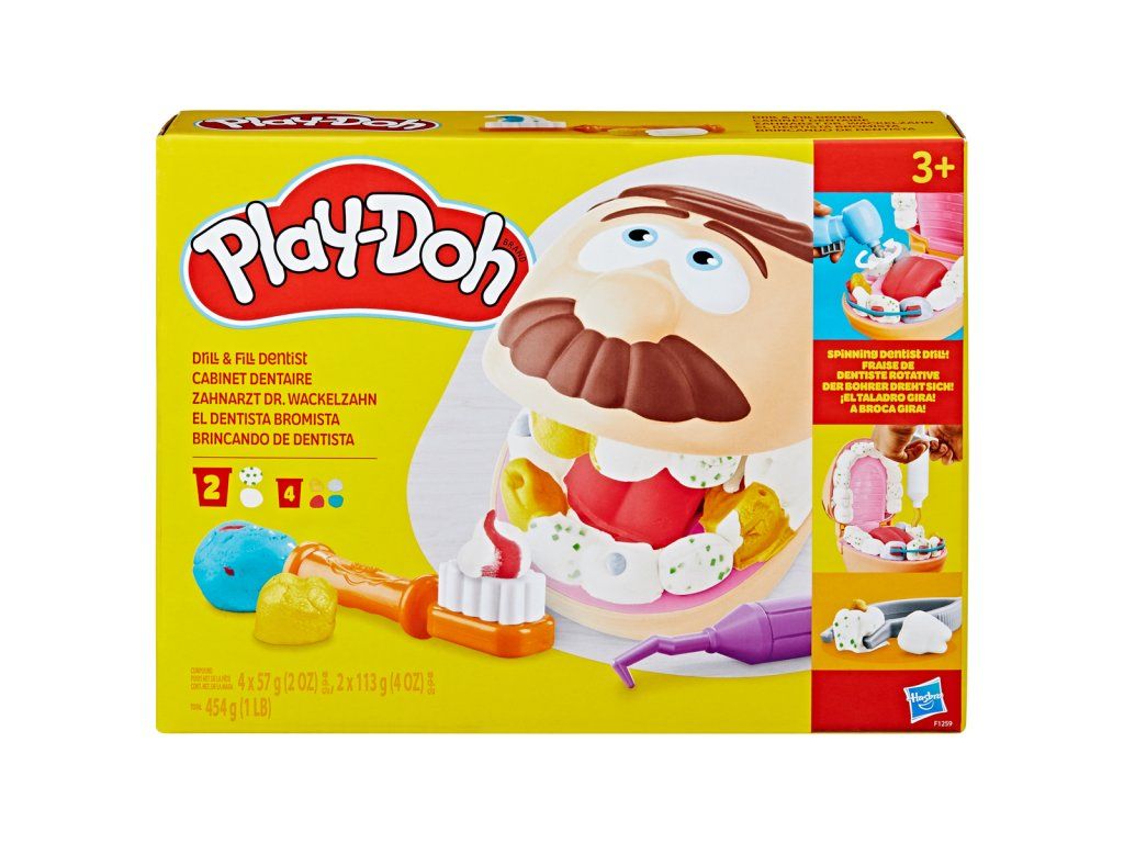 Doktor Drill 'n Fill je zpět a s ním více kazů než kdykoli předtím! Obsahuje zubní kazy v podobě konfet, zlatou a stříbrnou hmotu pro rovnátka a výplně a novou rotační vrtačku bez baterie. Zahrajte si na zubaře. Vytvořili jsme zcela novou formu na zuby a sada obsahuje všechny známé zubařské nástroje. Vyplázněte jazyk, vymačkejte zubní pastu a nezapomeňte na čištění mezizubních prostor! Děti díky herní sadě pochopí důležitost pravidelného čištění zubů. Mohou si vymodelovat nové zoubky, plomby, nasadit rovnátka nebo ošetřit zub. Sada obsahuje hlavu zubaře s příslušenstvím a 6 kelímků kvalitní modelíny. Věk 3+