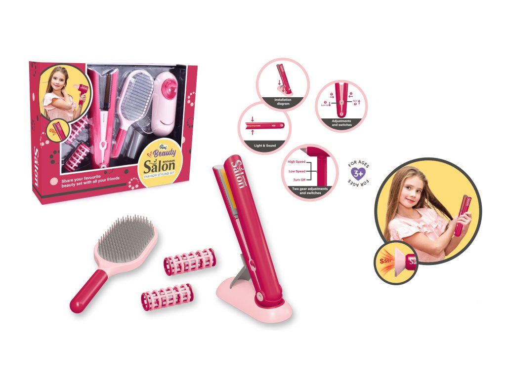 Kadeřnická sada se žehličkou, hřebenem a dalšími doplňky pro malé parádnice.
