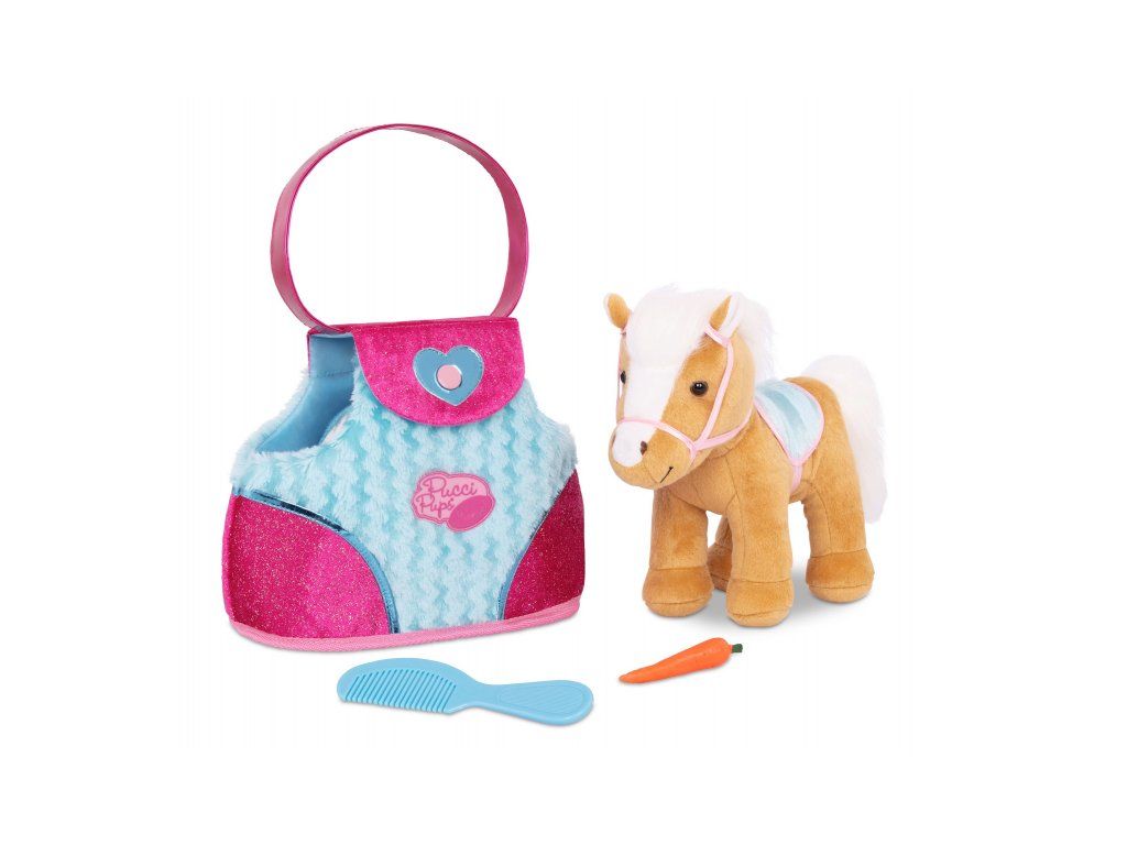 Nádherný plyšový poník v tašce s krásným potiskem je vždy připravený na mazlení i na procházku. Miluje vyčesávání své hebké hřívy hřebínkem a díky tašce si ho vaše dítě může vzít kamkoli. Taška má postranní otvory, aby poník při přenášení viděl na svět.