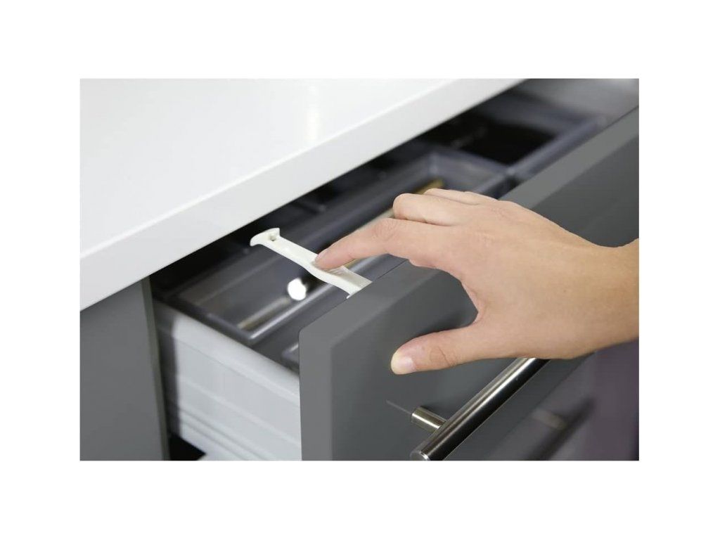 Pojistka do zásuvek brání dítěti otevřít zásuvku a dostat se k jejímu obsahu. Dospělý zásuvku snadno otevře stisknutím západky.