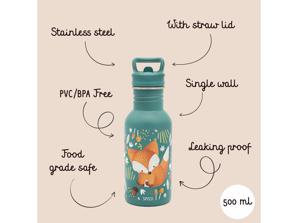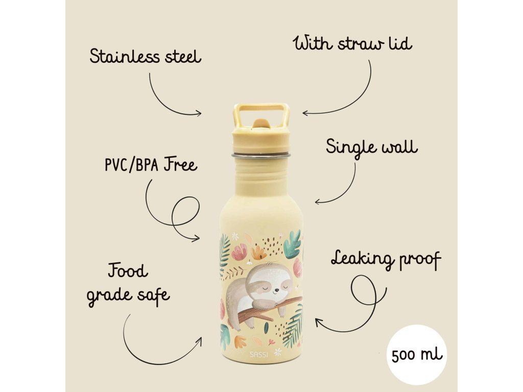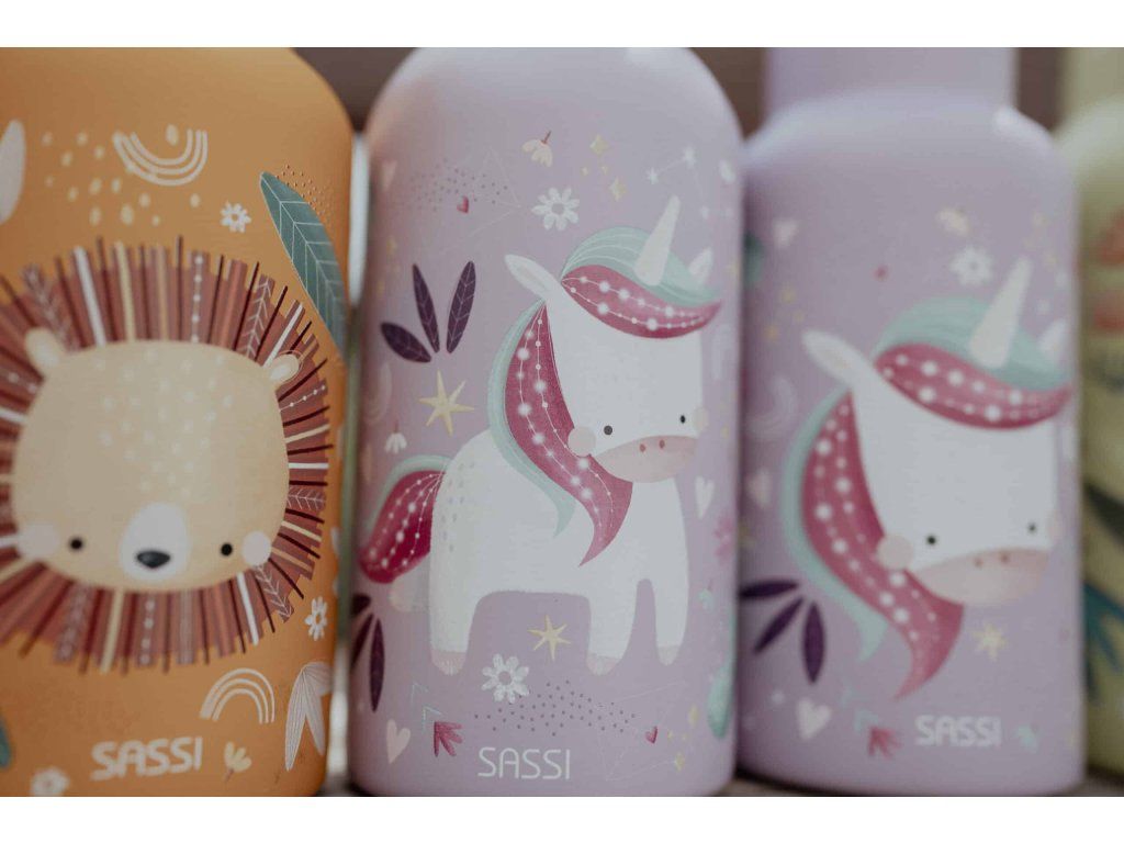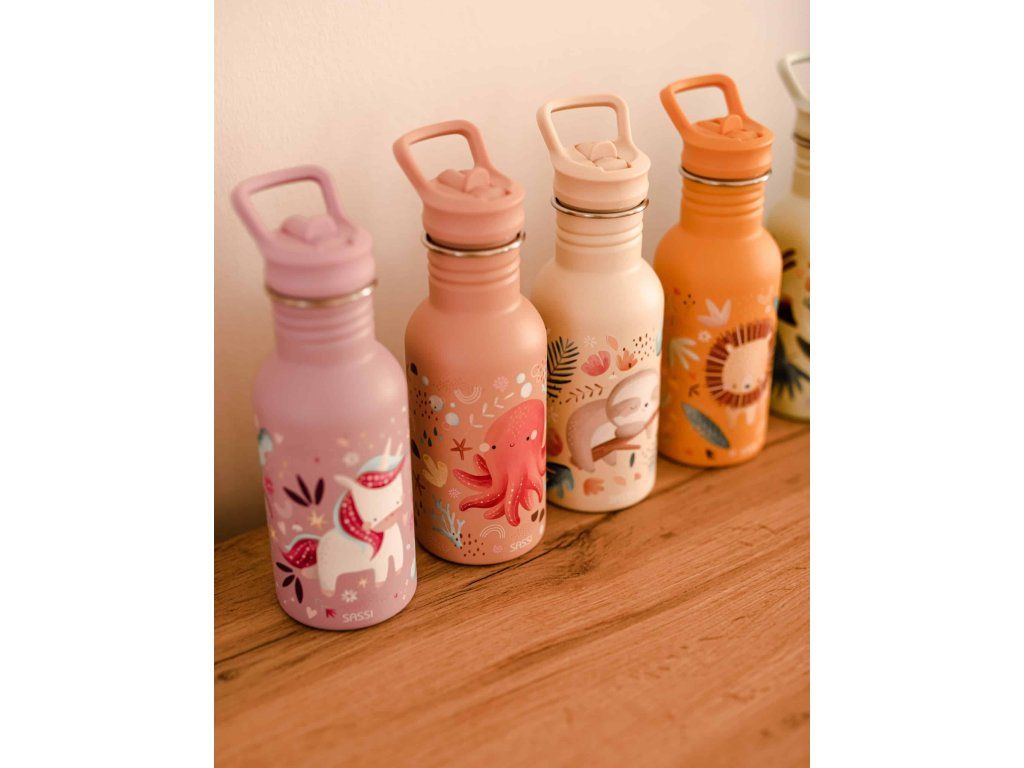 Navržena tak, aby vydržela – dětská láhev SASSI z nerezové oceli o objemu 500 ml je dokonalou kombinací odolnosti, bezpečnosti a stylu, vytvořená tak, aby doprovázela vaše nejmenší na všech jejich dobrodružstvích.