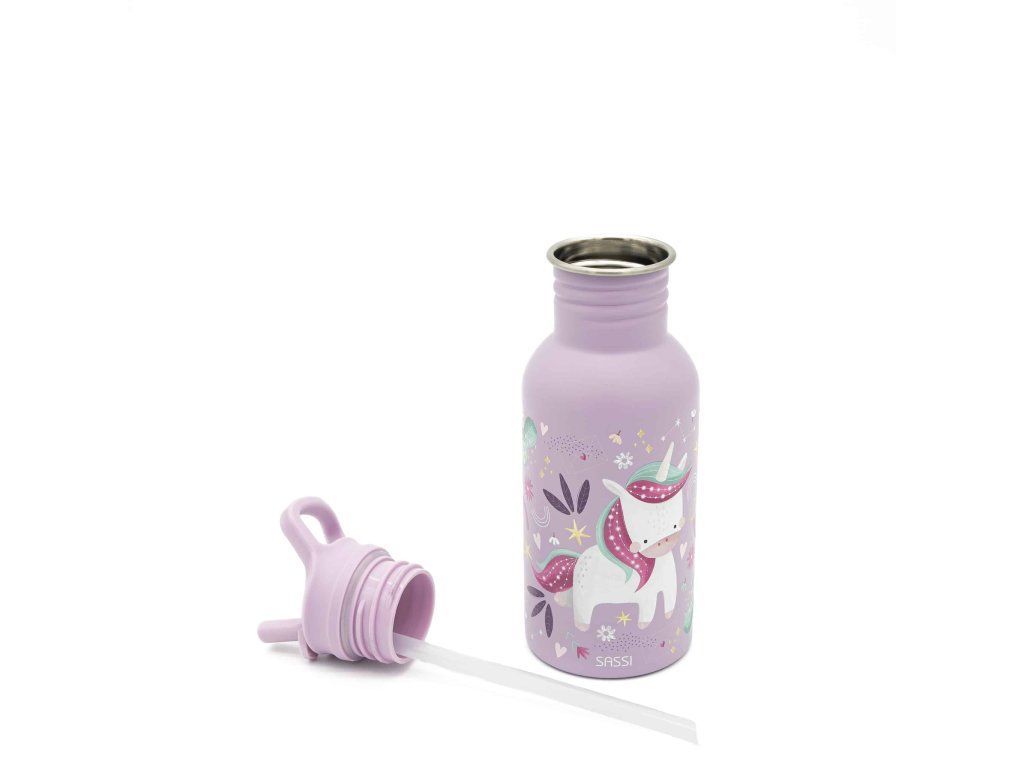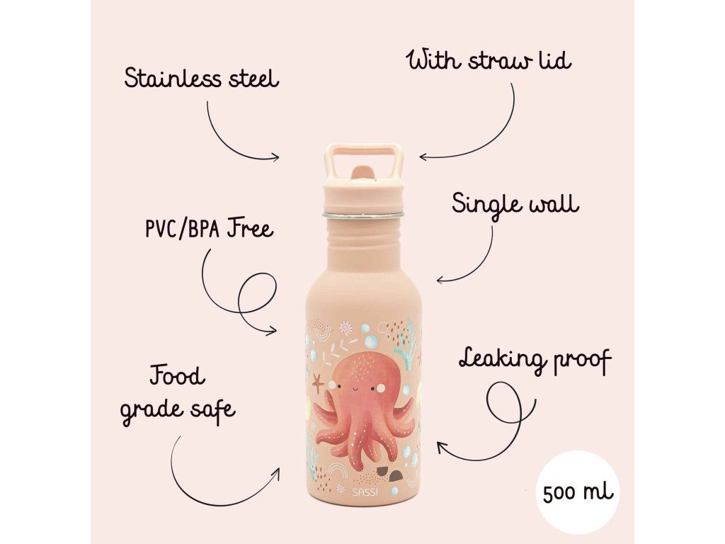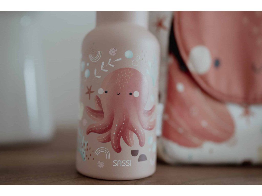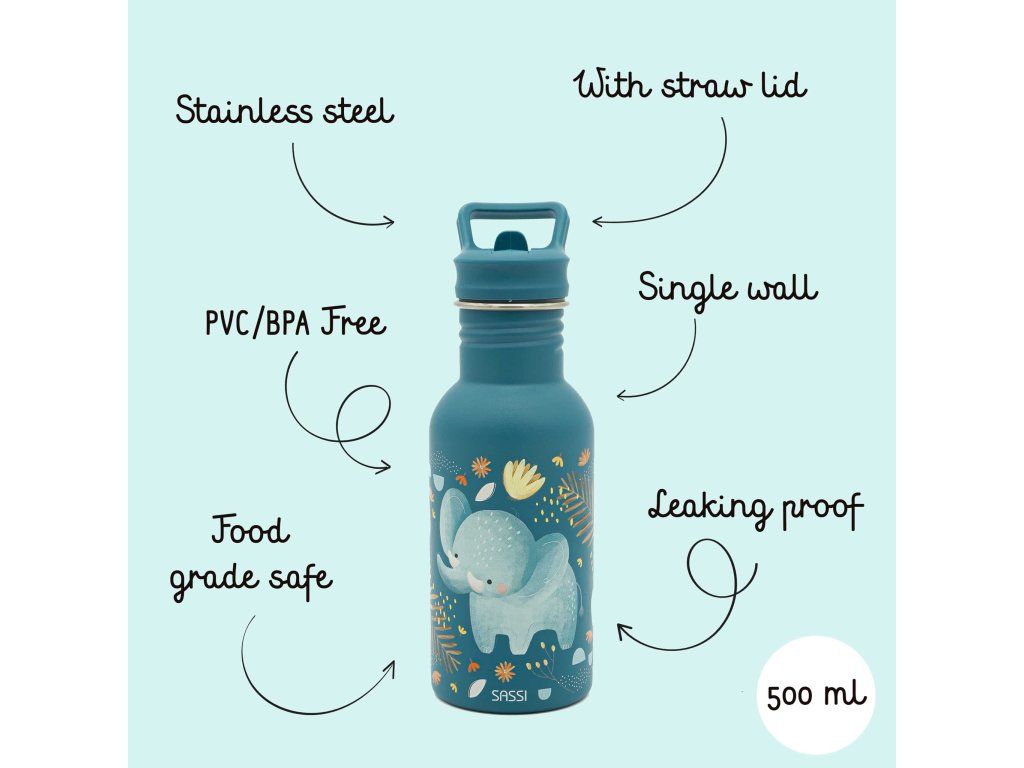 Navržena tak, aby vydržela – dětská láhev SASSI z nerezové oceli o objemu 500 ml je dokonalou kombinací odolnosti, bezpečnosti a stylu, vytvořená tak, aby doprovázela vaše nejmenší na všech jejich dobrodružstvích.