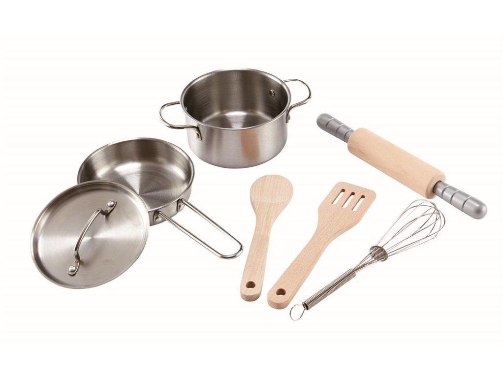 Co bude dnes k obědu? Budoucí šéfkuchař může s touto základní sadou nádobí vařit a neustále se ve svém umění zlepšovat! Sada nadchne chlapce i dívky. Sada obsahuje 7 ks. Hračka rozvíjí dětskou fantazii a představivost. Rozvíjí jemnou motoriku a koordinaci očí a rukou. Vyrobeno z kvalitního a odolného dřevěného a kovového materiálu. Věk: 3+. Rozměr: 26 x 8 x 26 cm.