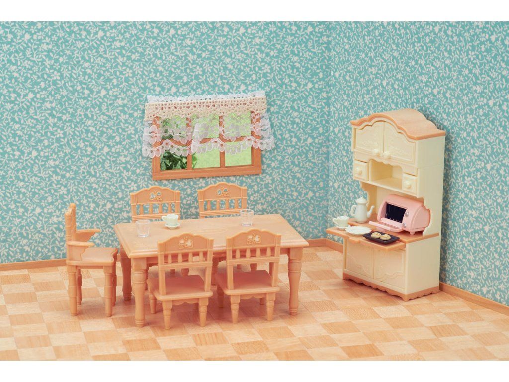 Jídelní sada obsahuje jídelní stůl, 4 židle, dětskou židli a kredenc pro uložení kuchyňských potřeb. Čajovou soupravu a malou teplovzdušnou troubu lze uložit do kuchyňské skříňky. Stůl je vybaven 4 židlemi pro dospělé i děti a dětskou židlí. Pomocí jednotného designu kombinujte s jídelní soupravou a dalšími figurkami, abyste vytvořili velkou jídelnu (prodává se samostatně). Věk: 3+