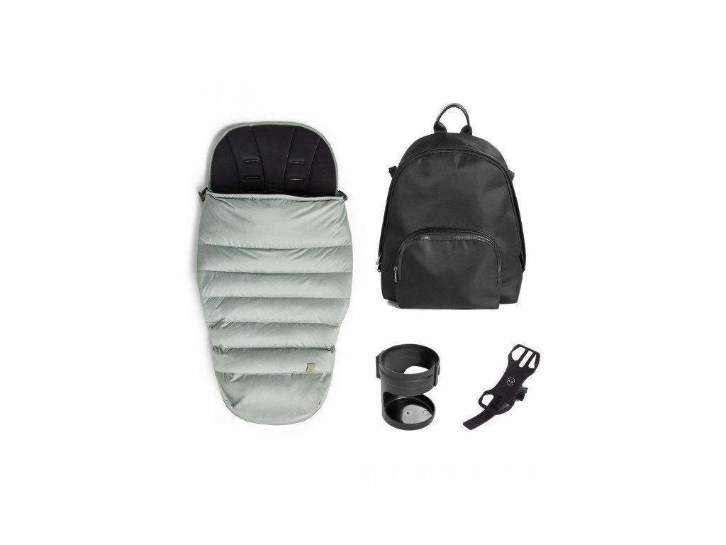 Sada doplňků pro kočárek Silver Cross Tide obsahuje luxusní fusak, stylový přebalovací batoh, držák na nápoje a držák na mobil.