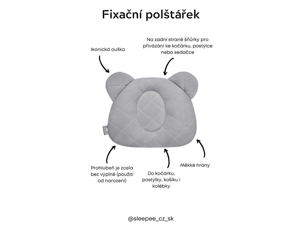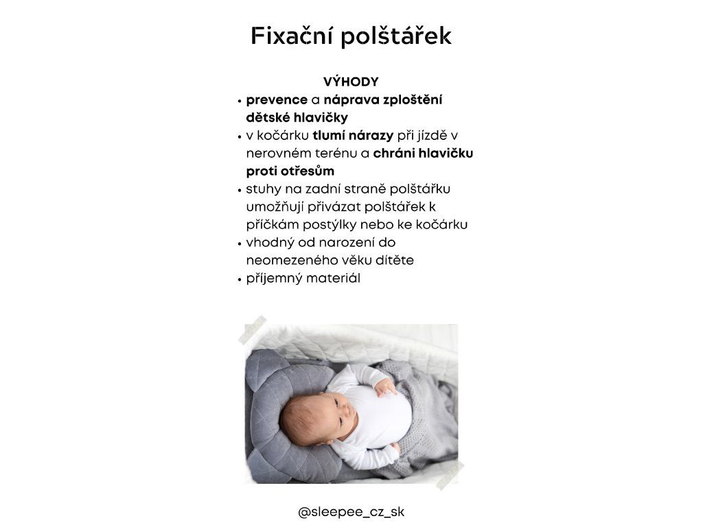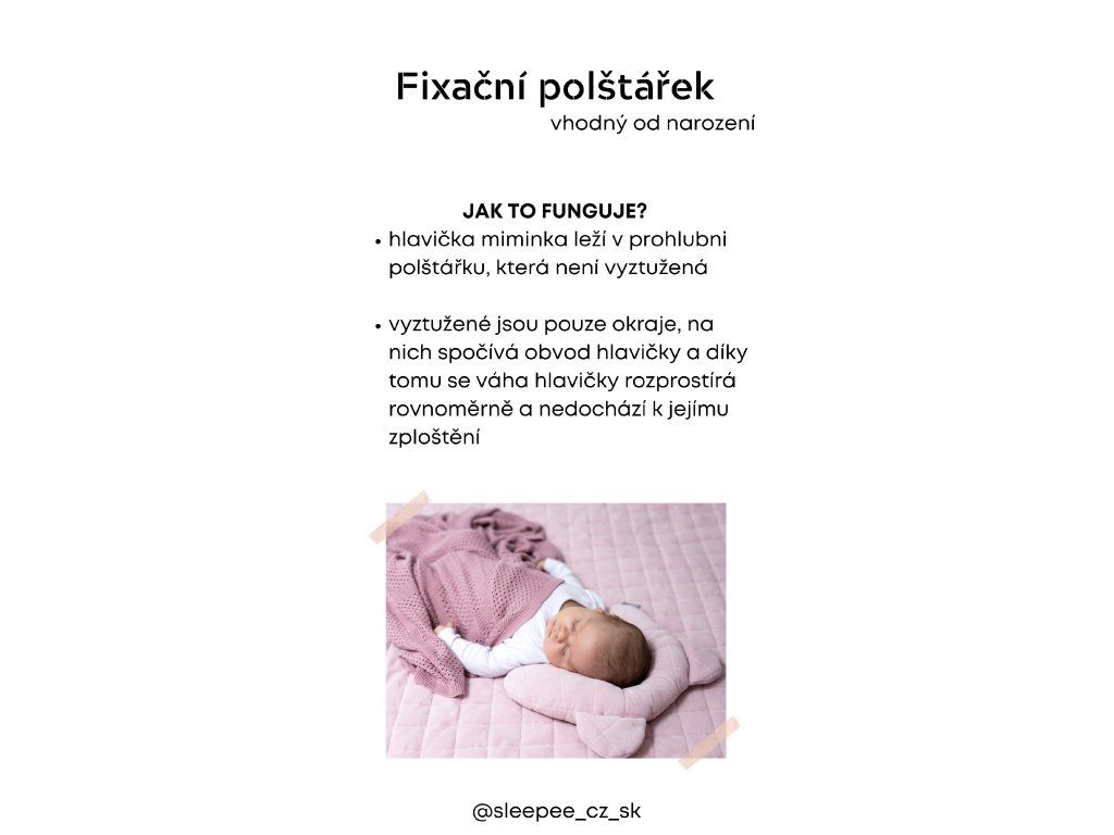 Fixační podhlavník má speciální výklenek, díky kterému hlavička dítěte spočívá na měkkých hranách a netlačí celou vahou těla na podložku, na které leží. Citlivá dětská hlavička je tak chráněna proti zploštění.