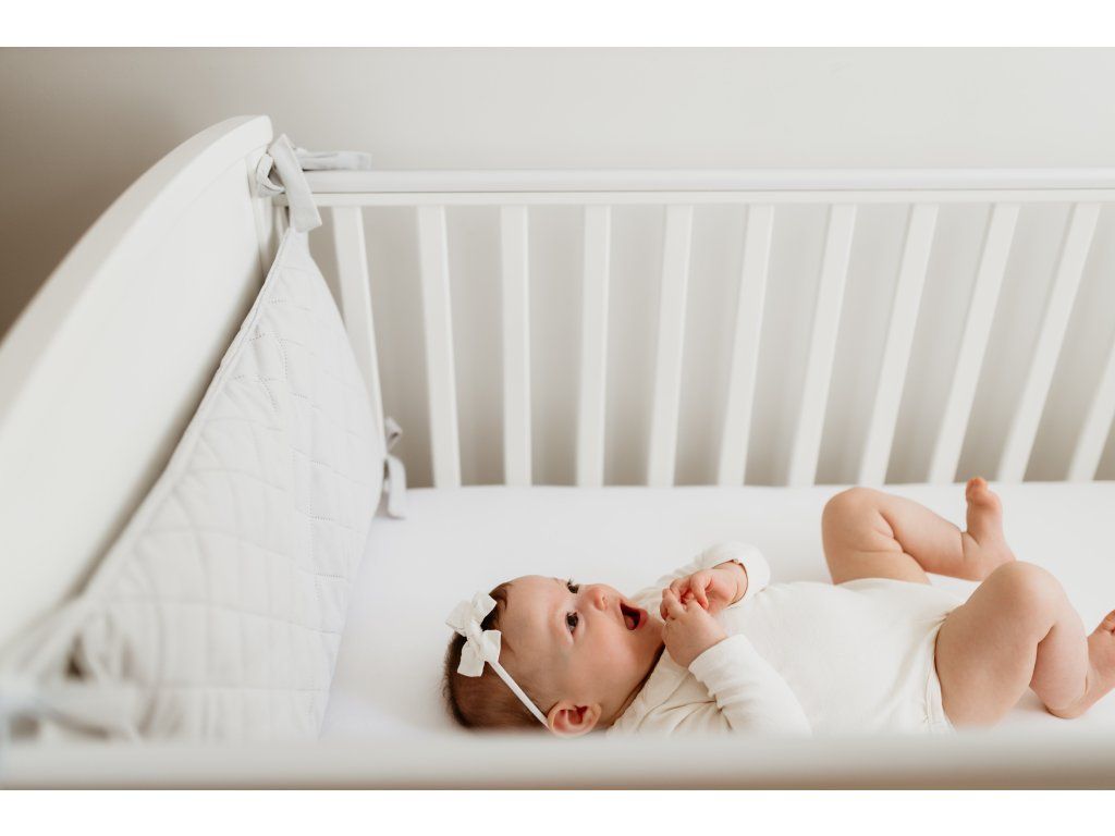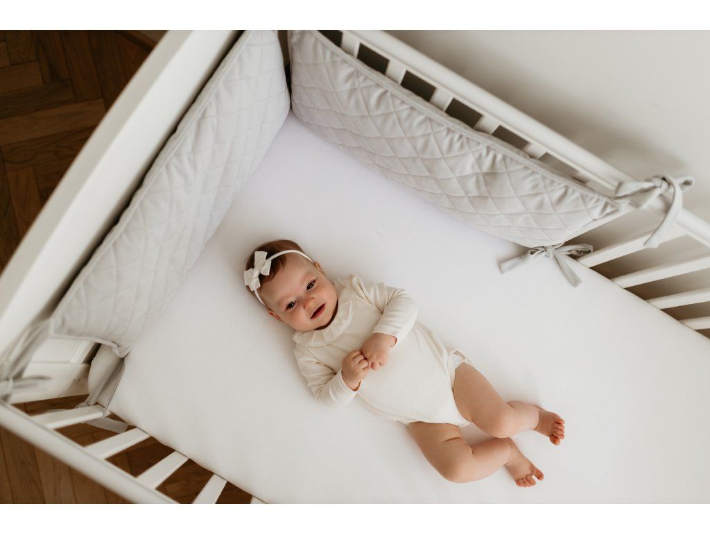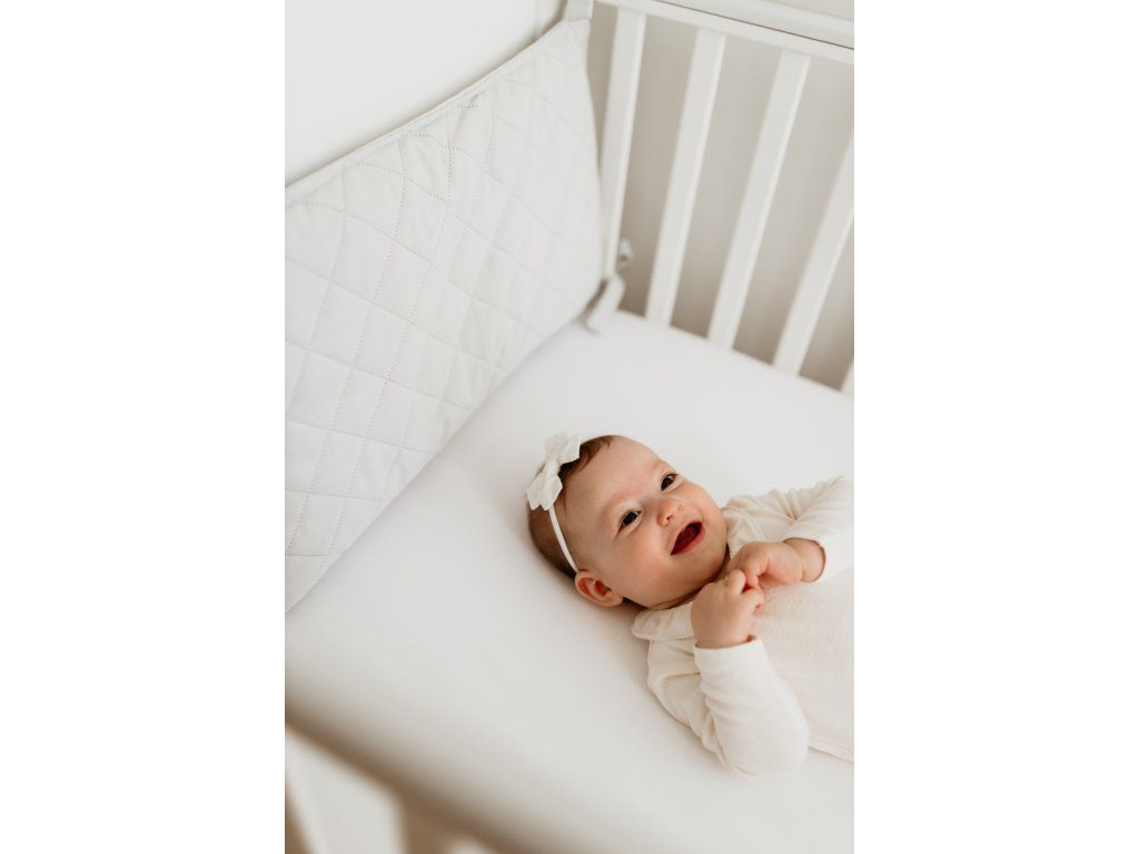 Nastavitelný mantinel do dětské postýlky chrání hlavičku dítěte před nechtěným zraněním či nárazem do příček postýlky.