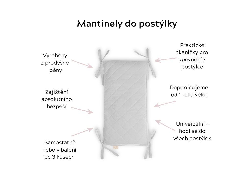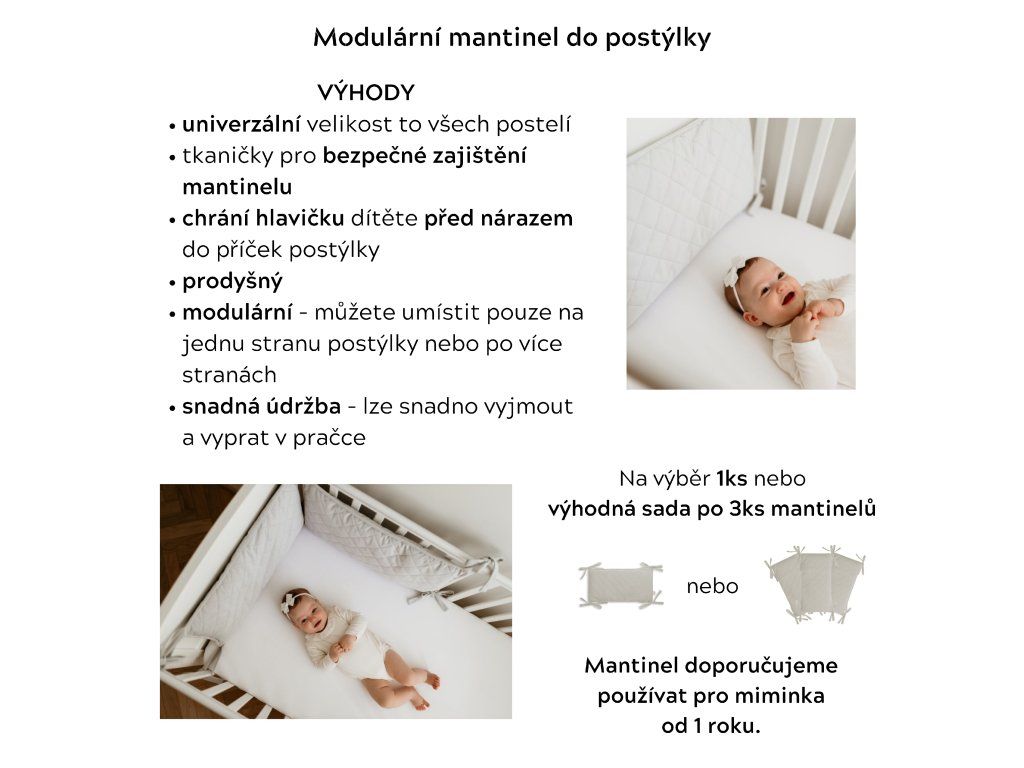 Upozornění: Z bezpečnostních důvodů doporučujeme mantinel používat po 1. roce dítěte. V tomto věku se dítě začíná v postýlce více pohybovat a mantinel ochrání hlavičku před nechtěným nárazem.