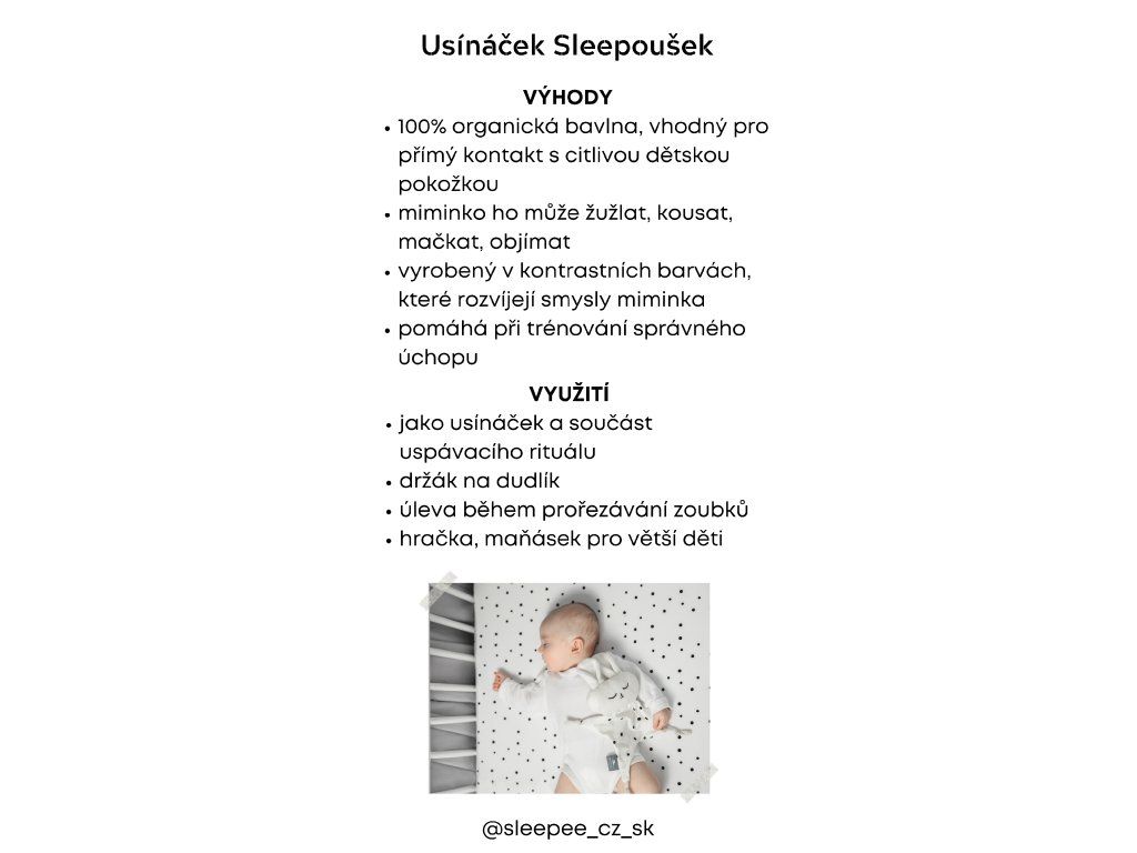 Typický Sleepee vzor je - černé tečky na bílém pozadí je kontrastní a podporuje smyslový vývoj děťátka. Černá, bílá a odstíny těchto barev jsou první barvy, které miminko rozeznává.