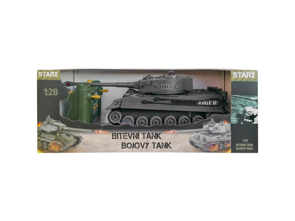 Tank s dálkovým ovládáním, infračervený, 2,4 GHz. Tank aktivujete tlačítkem Zapnuto na jeho spodní straně. Tlačítkem STŘELBA na dálkovém ovladači spustíte zvukové a světelné efekty výstřelu. Tank jezdí všemi směry, pohyb se řídí pohybem páček na dálkovém ovladači. Pohyb tanku vpřed posun obou páček vpřed na ovladači, jízda vzad - posun obou páček dozadu. Otáčení tanku posun jedné páčky dopředu nebo dozadu. Otáčení děla tanku tlačítka v horní části ovladače vlevo nebo vpravo. Provoz tanku na bateriový akumulátor (součást balení, nabíjení přes nabíječku. Dálkový ovladač na 2x1,5V baterie AA - nejsou součástí balení. V případě zakoupení 2. tanku si můžete zahrát tankovou bitvu. Každý hráč má 4 životy – světla na zadní části tanku. Po každém zásahu jedno světlo zhasne, prohrává ten, komu se nejprve rozblikají světla na zadní části tanku.