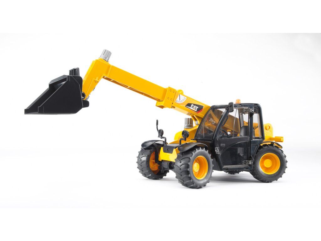 Stavební vozy - CAT nakladač s teleskopickým ramenem 1:16. Teleskopický nakladač CATERPILLAR je skutečně všestranný pomocník. Jeho malá velikost a výsuvné teleskopické rameno jsou přesně to, co z něj dělá volbu číslo jedna pro mnoho různých použití. Model je ovládán čtyřmi stříbrnými otočnými ovladači. Kromě nastavení výšky ramene lze rameno prodloužit až do délky 40 cm, dále je možné naklápět přední lžíci. Nakladač má plně funkční čtyřkolové řízení – zatáčejí obě nápravy protisměrně, což umožňuje nakladači zmenšit poloměr zatáčení. Kabina s dveřmi, které se dají otevřít, je z průhledného nerozbitného polykarbonátu. Vozidlo je vybaveno profilovými pneumatikami, které si poradí v každém terénu. Je vhodný do interiéru i exteriéru. Rozměry: 340 x 140 x 140 mm